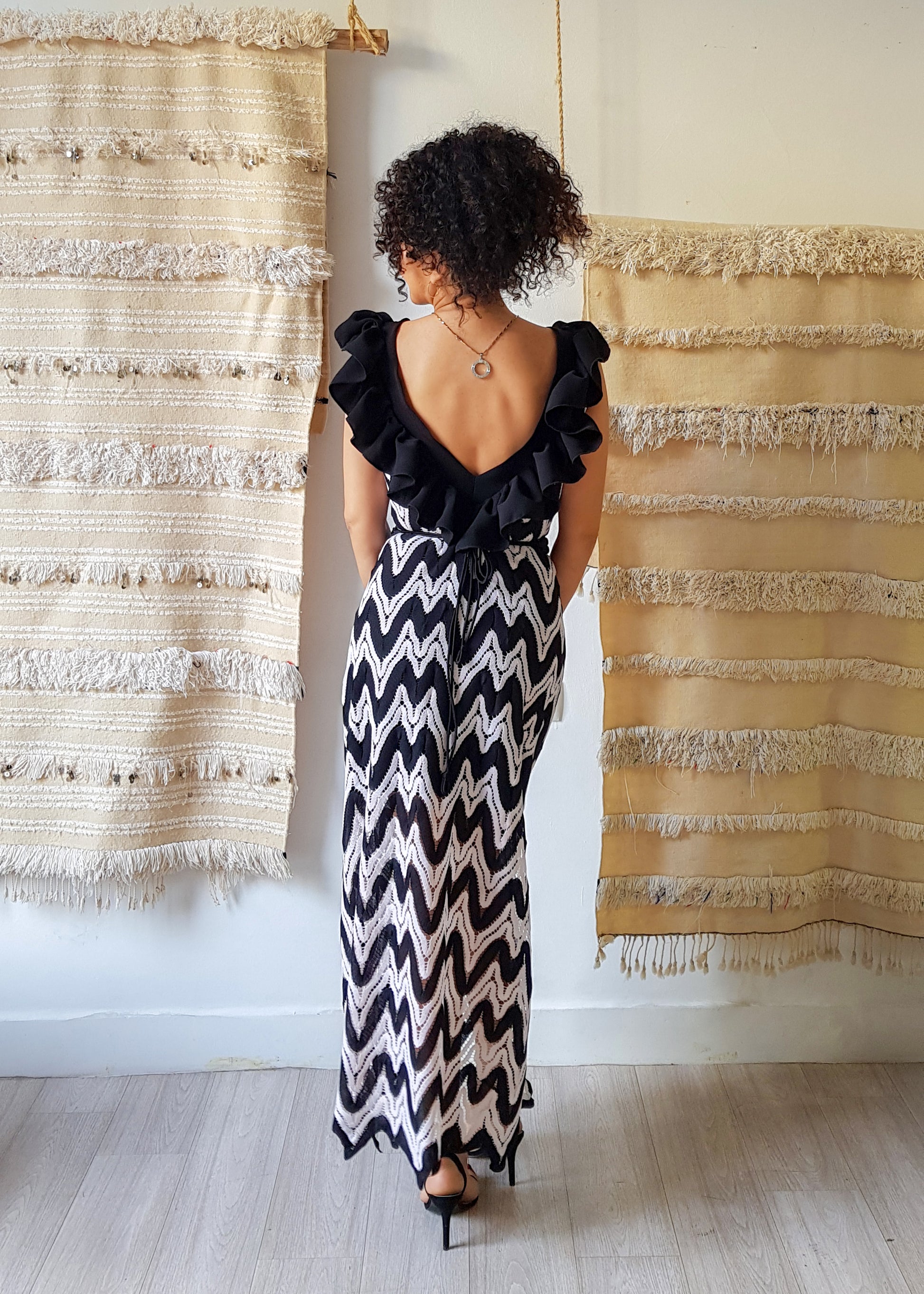 De la collection Printemps/Été 2020 : Notre robe cabo est fabriquée à la main à partir de dentelle rayée et présente des volants devant et derrière sur une silhouette ceinturée. Très chic et sexy parfait de nuit comme de jour. Il peut être porté avec des talons pour un look de nuit sexy ou des sandales pour un look de vacances parfait.