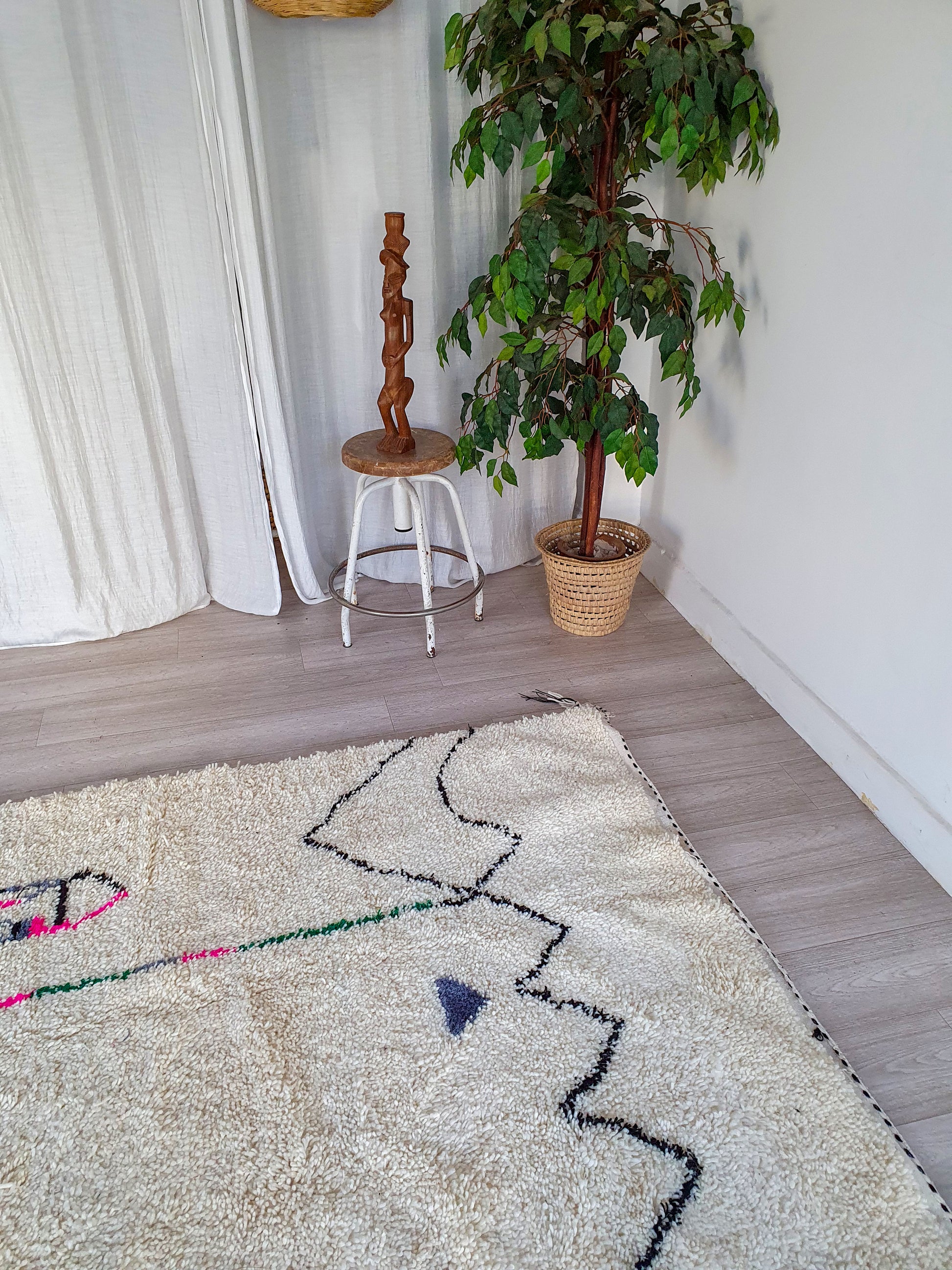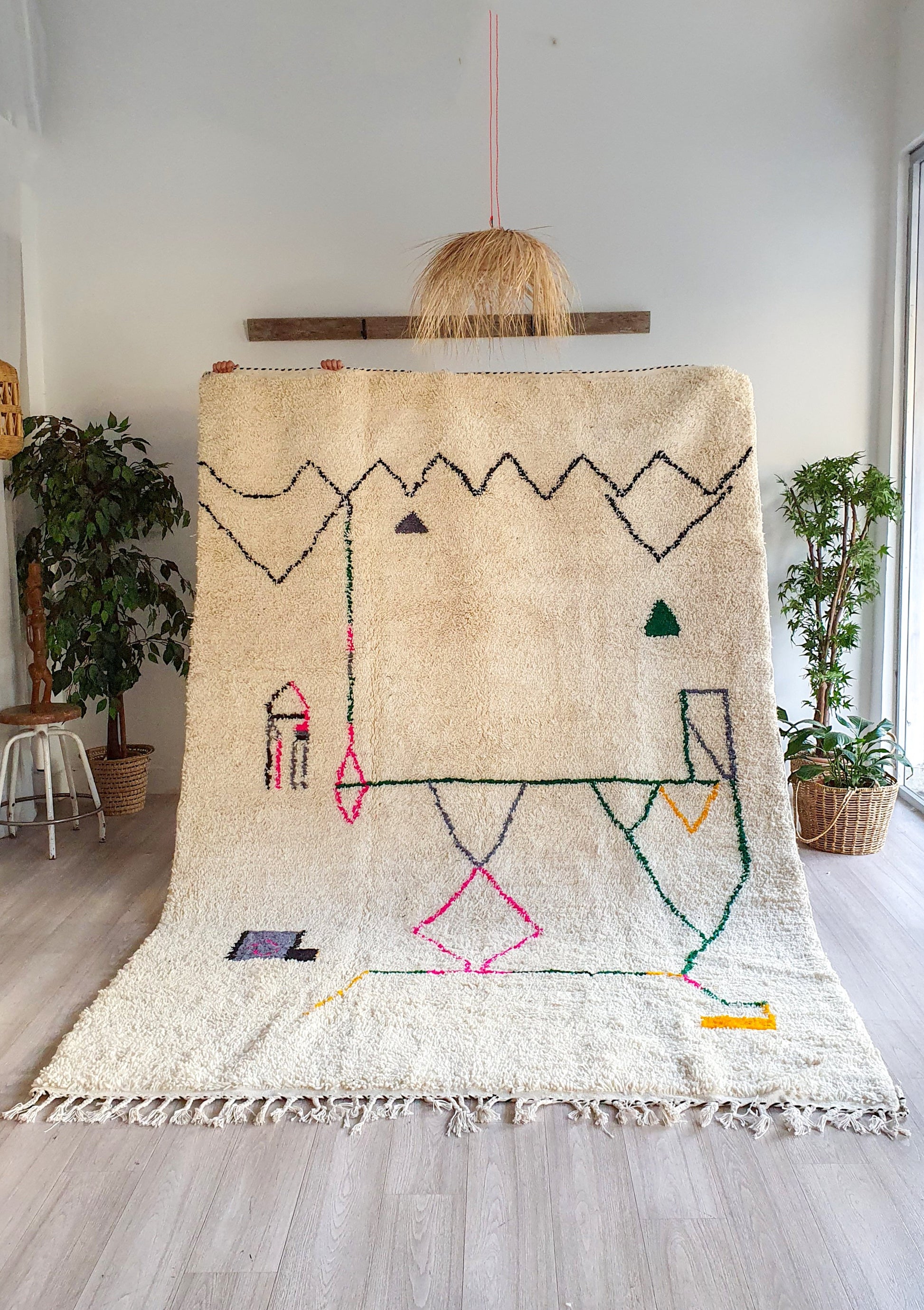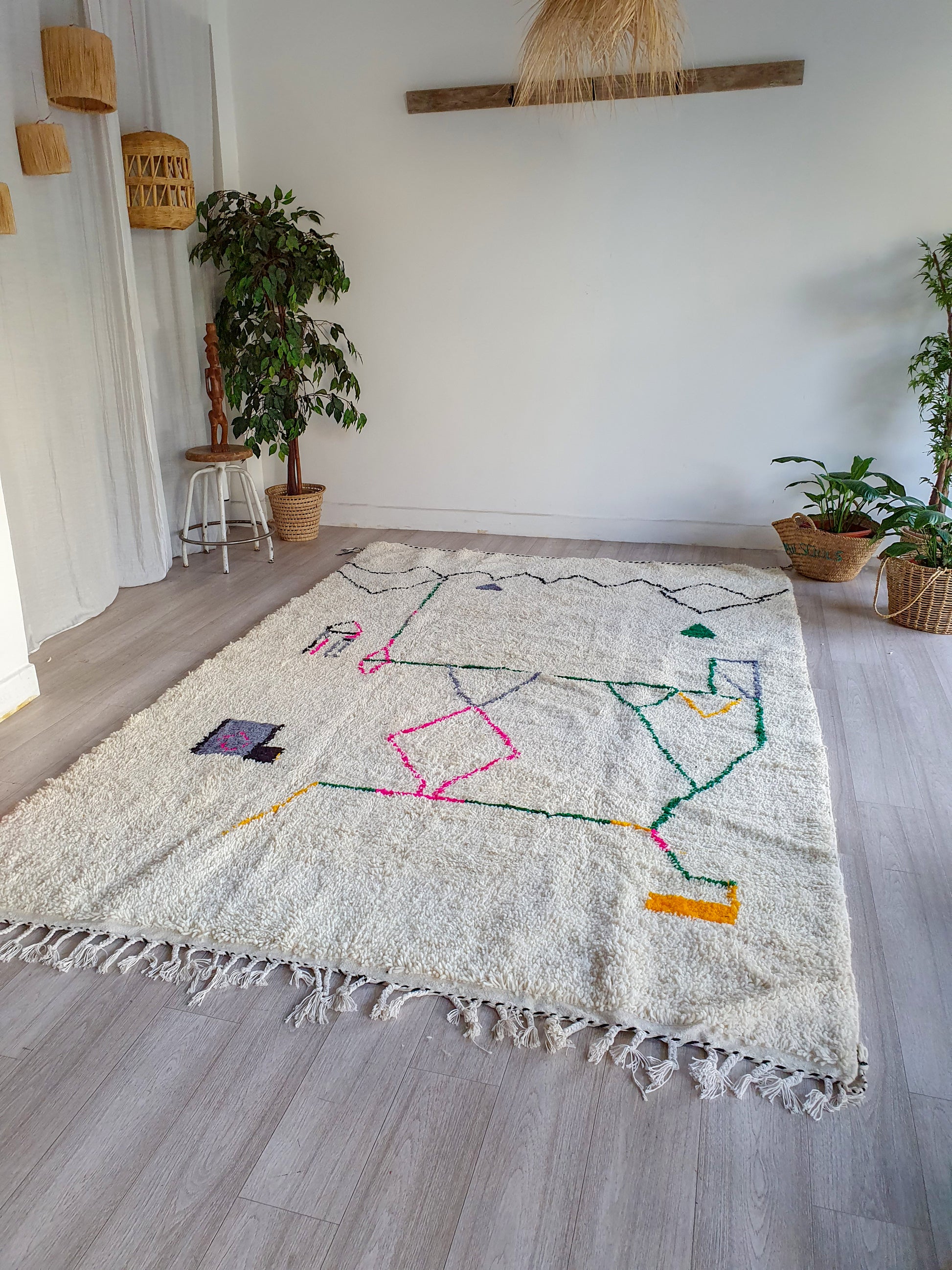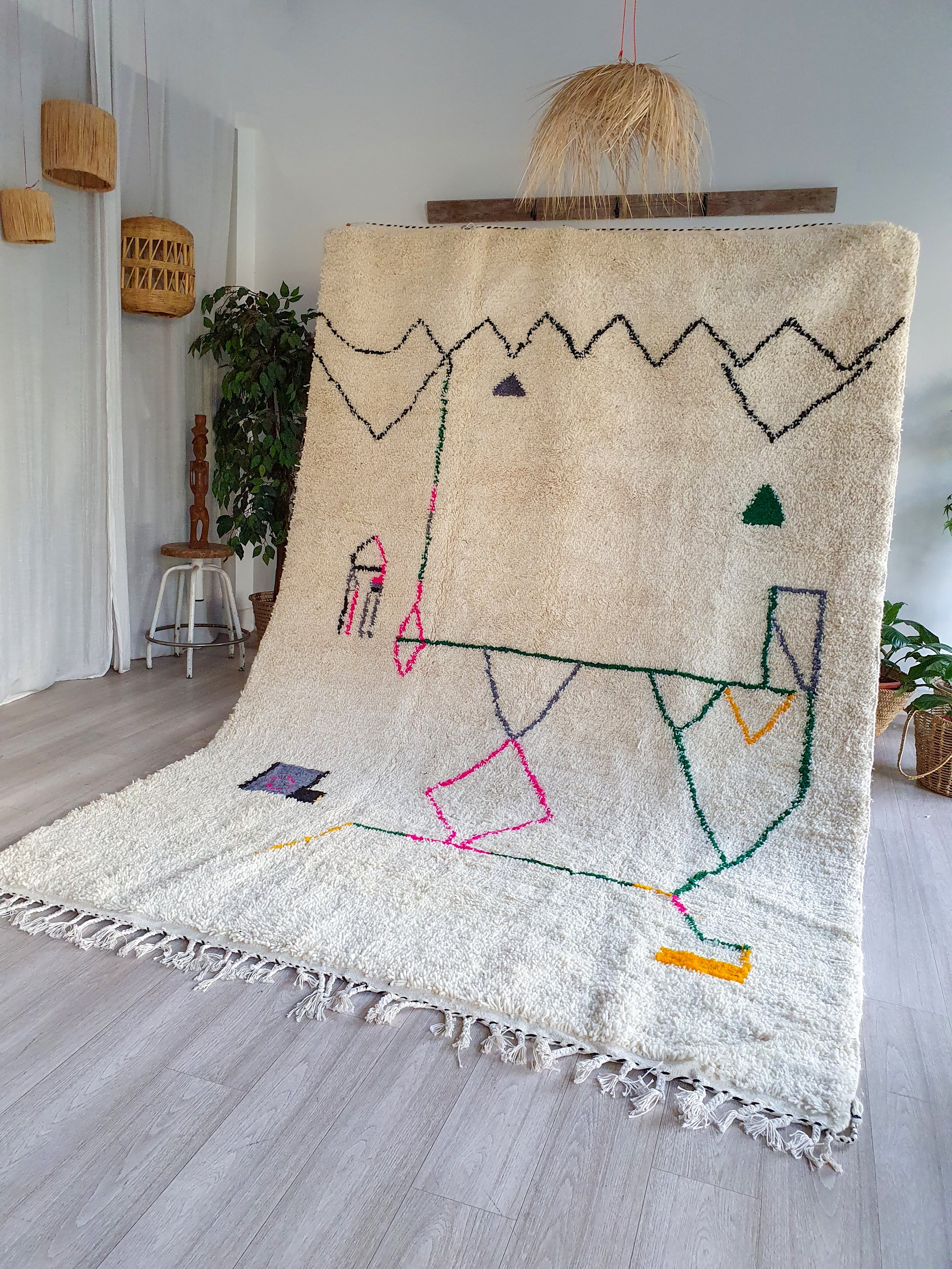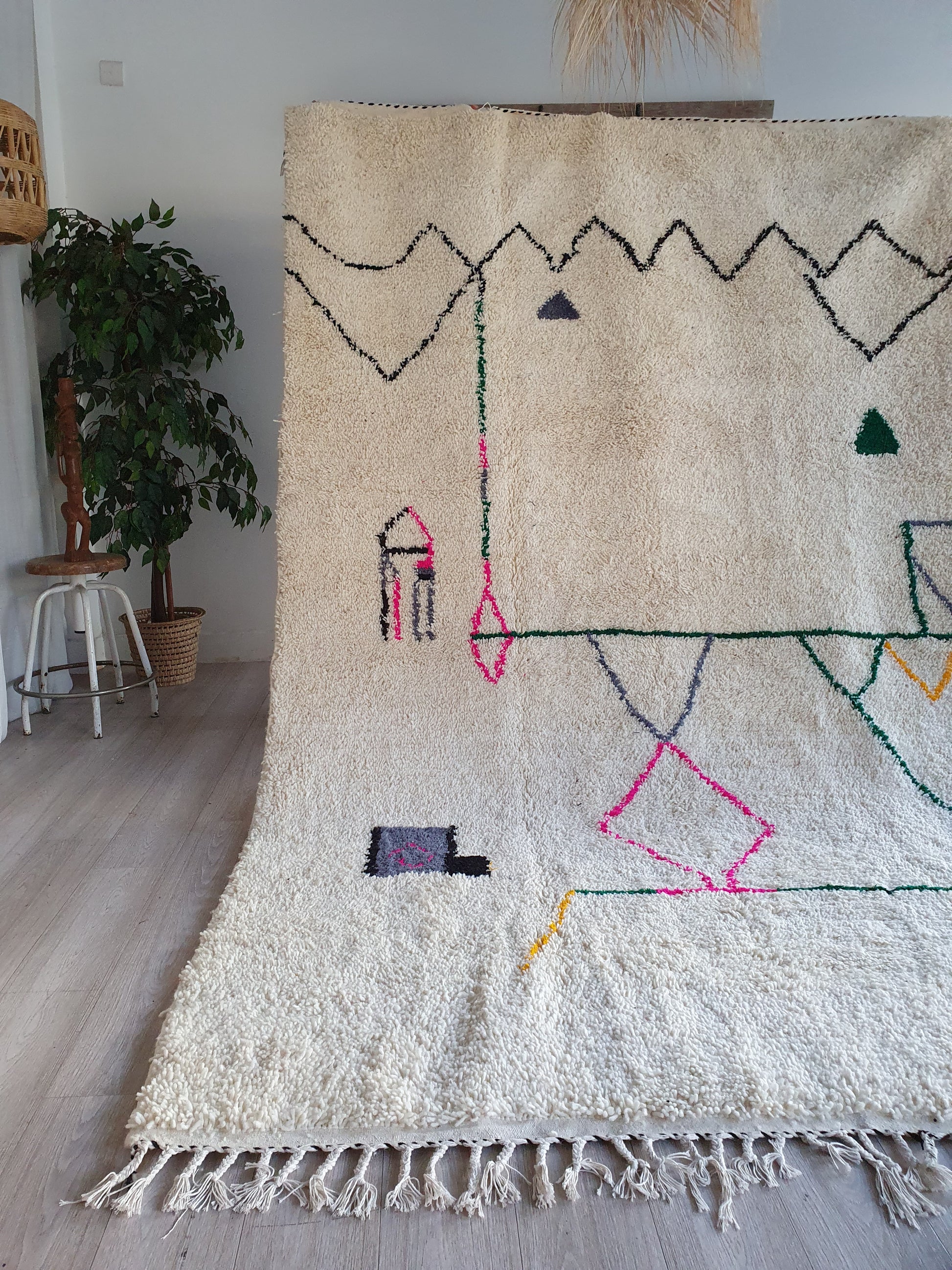 Veuillez noter que ces tapis sont entièrement tissés à la main par des femmes, donc toute imperfection mineure ne fait qu'ajouter à la beauté du tapis et à son caractère unique.