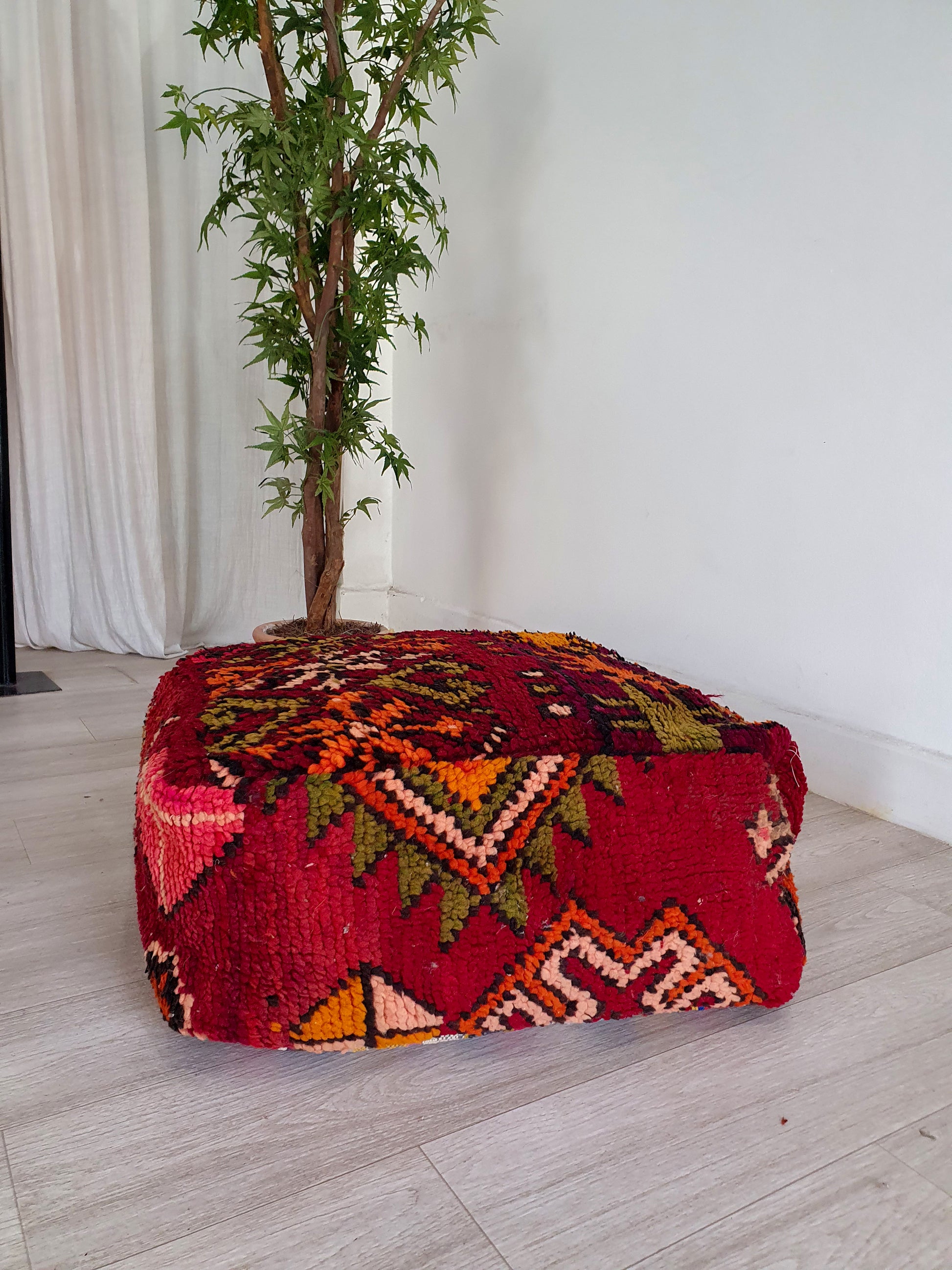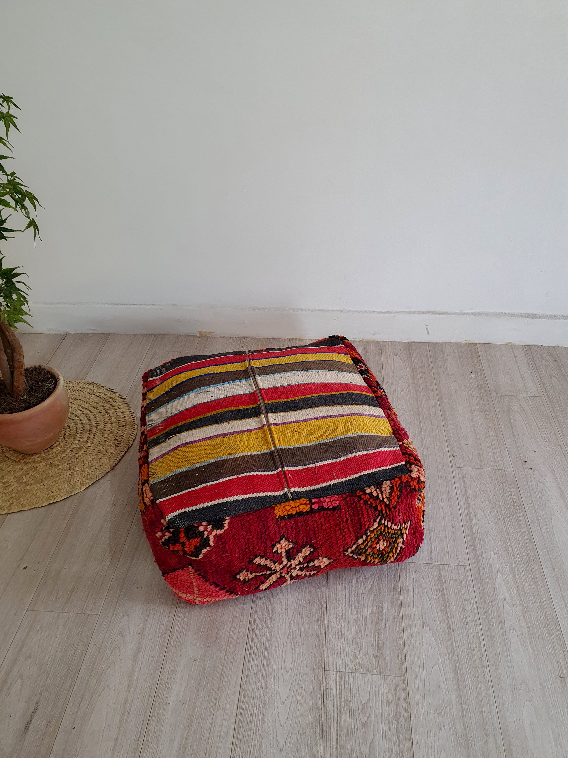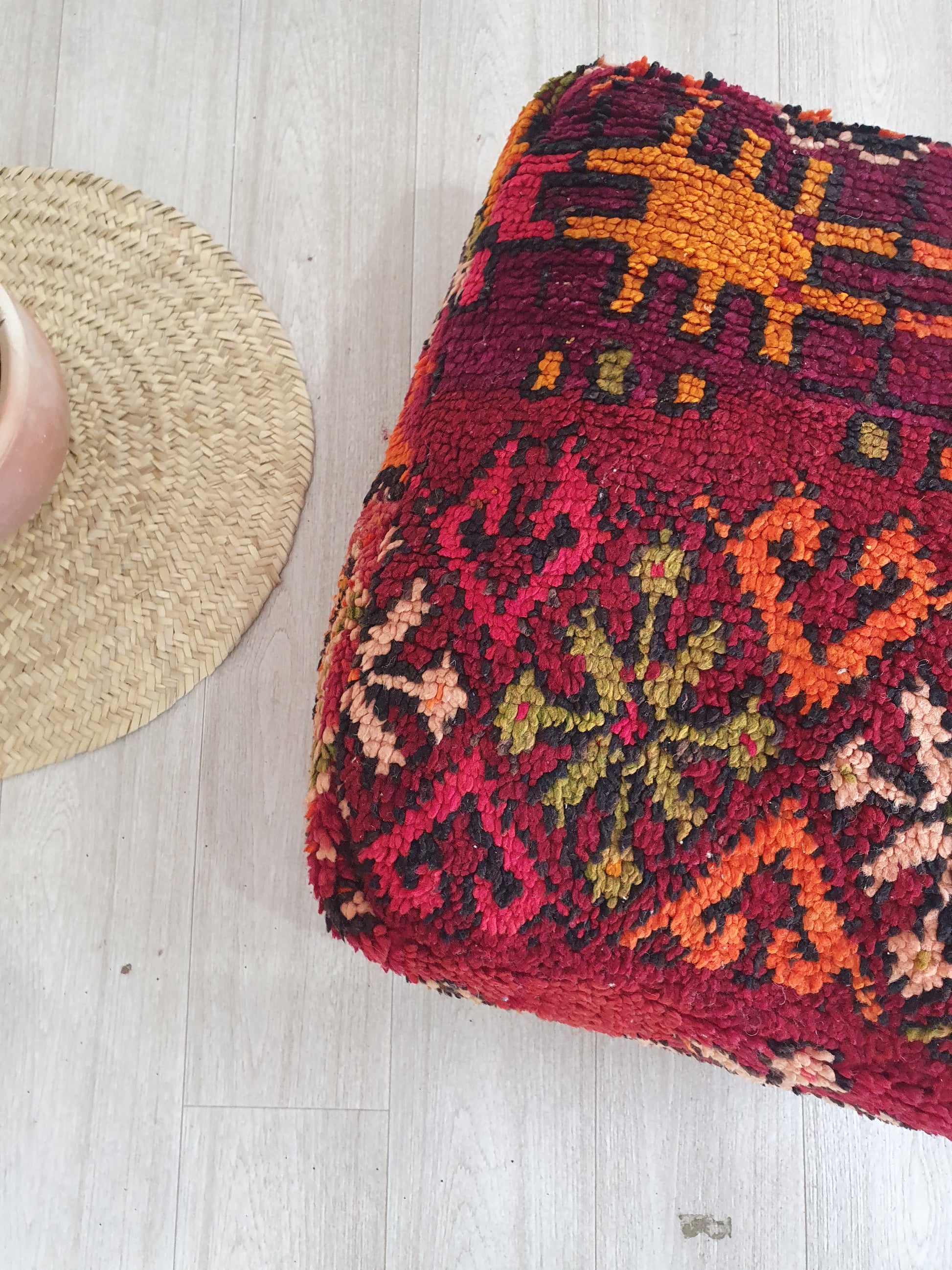 Celui-ci d’un genre pouf marocain. Il est fabriqué à la main par des femmes berbères à partir de kilim vintage, Beni ourain, Azilal et d'autres types de tapis faits à la main. Chaque pouf est unique et chacun a une histoire.