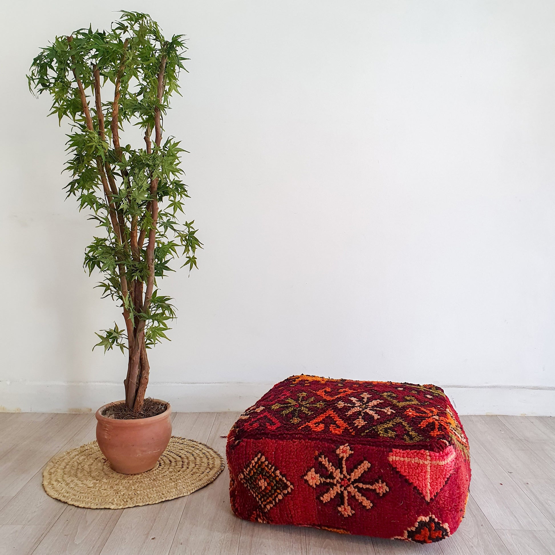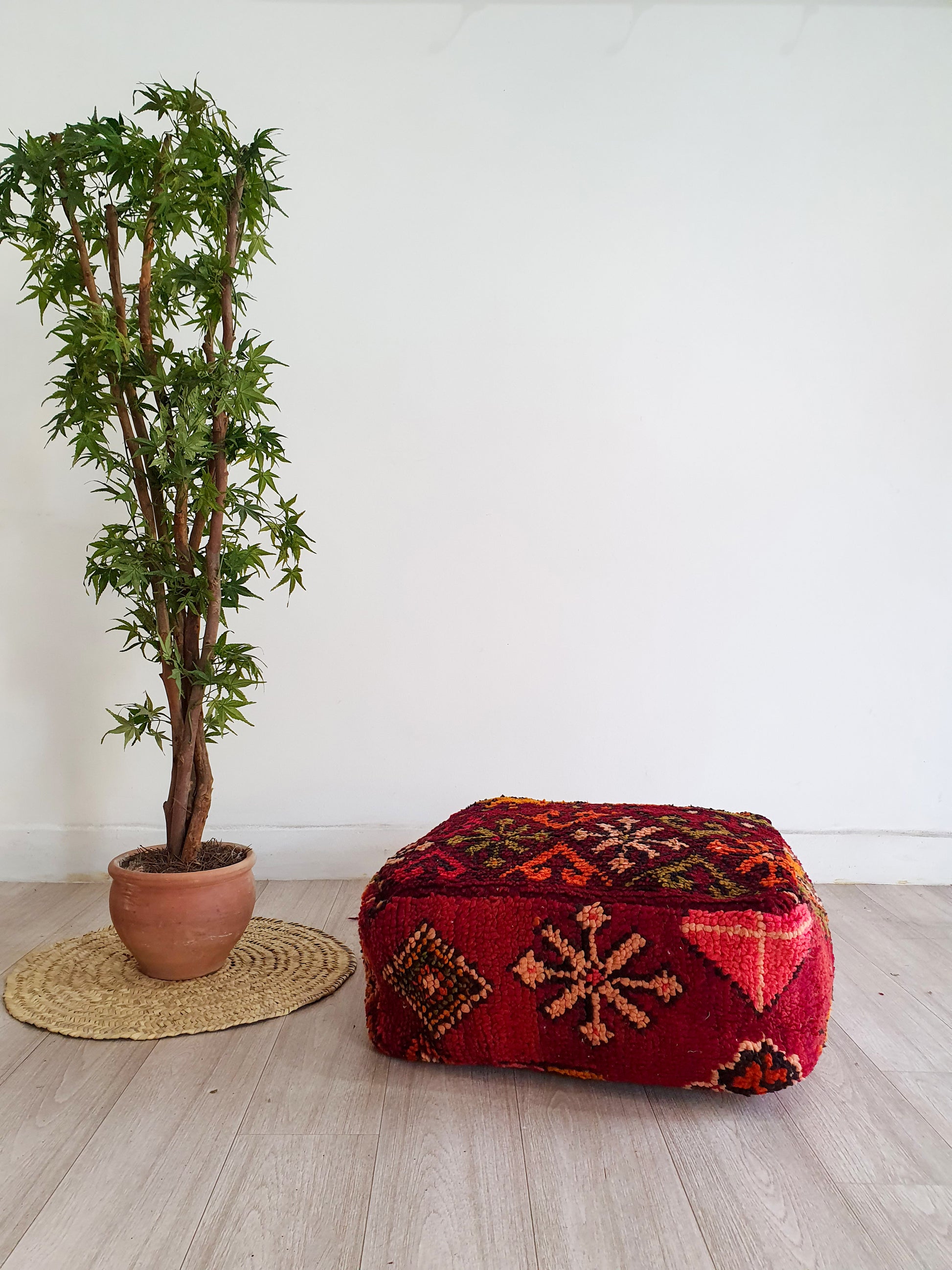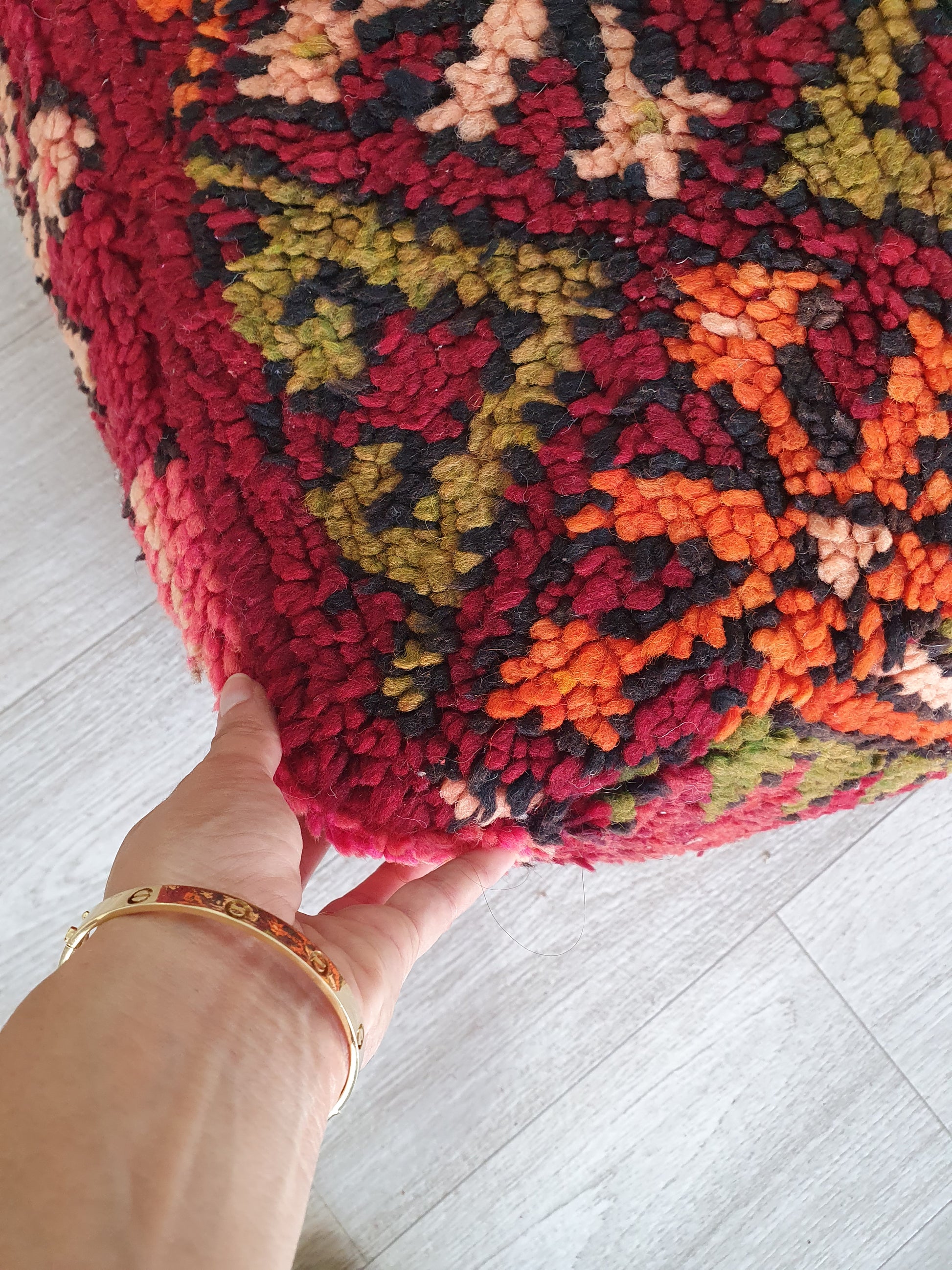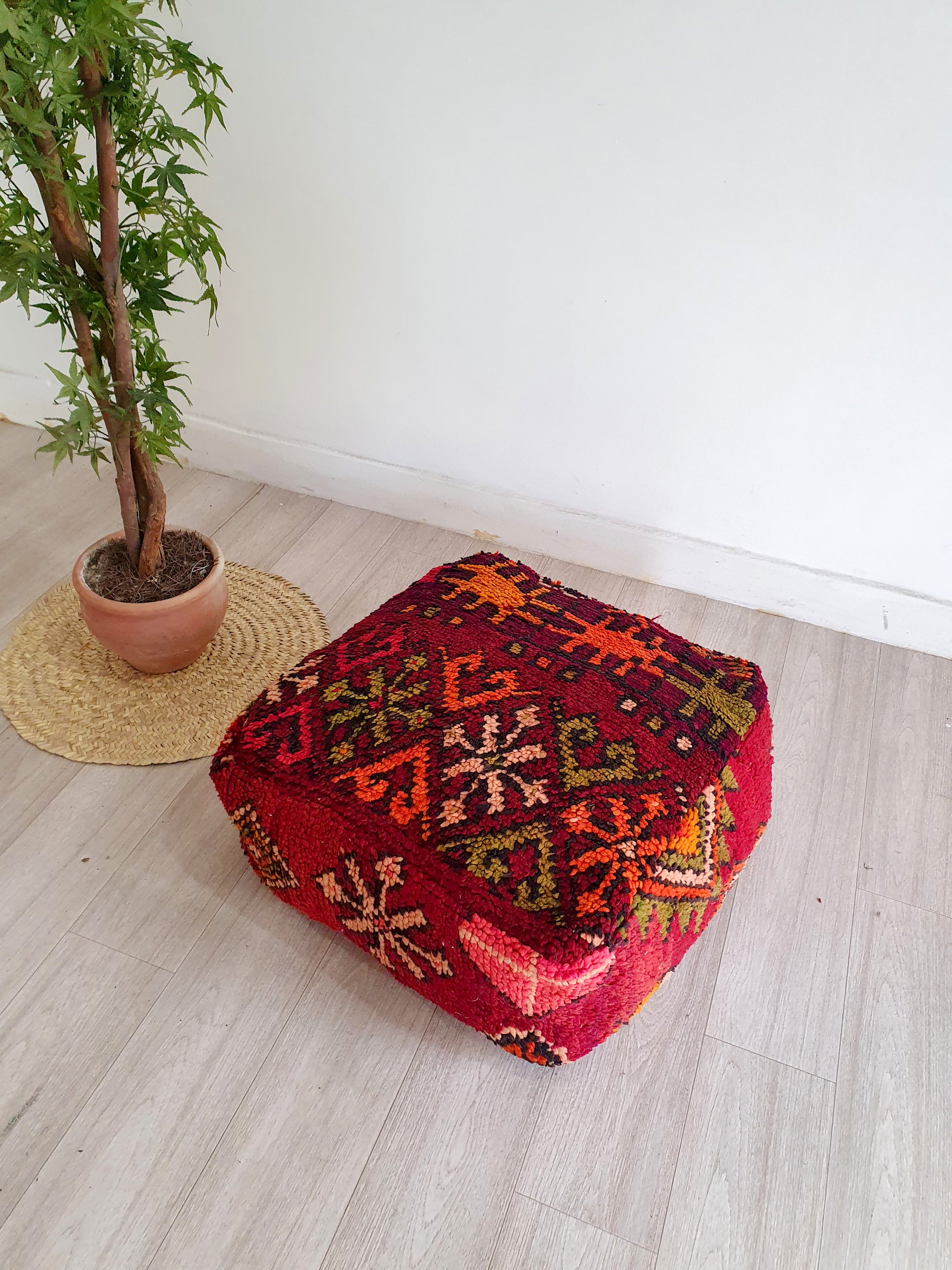 Celui-ci d’un genre pouf marocain. Il est fabriqué à la main par des femmes berbères à partir de kilim vintage, Beni ourain, Azilal et d'autres types de tapis faits à la main. Chaque pouf est unique et chacun a une histoire.