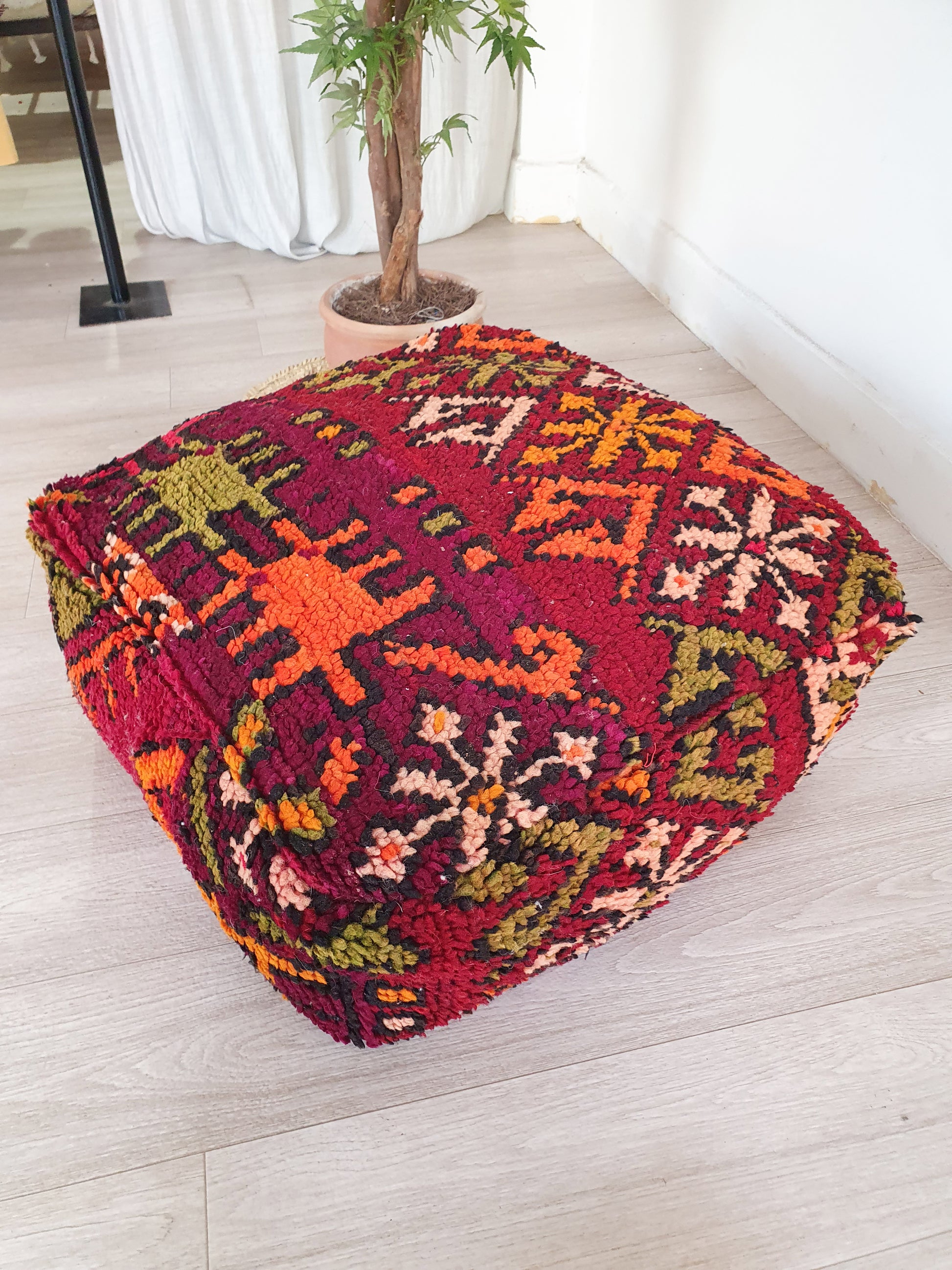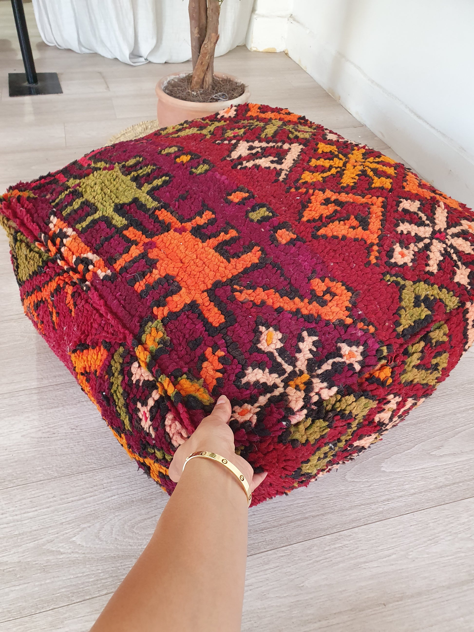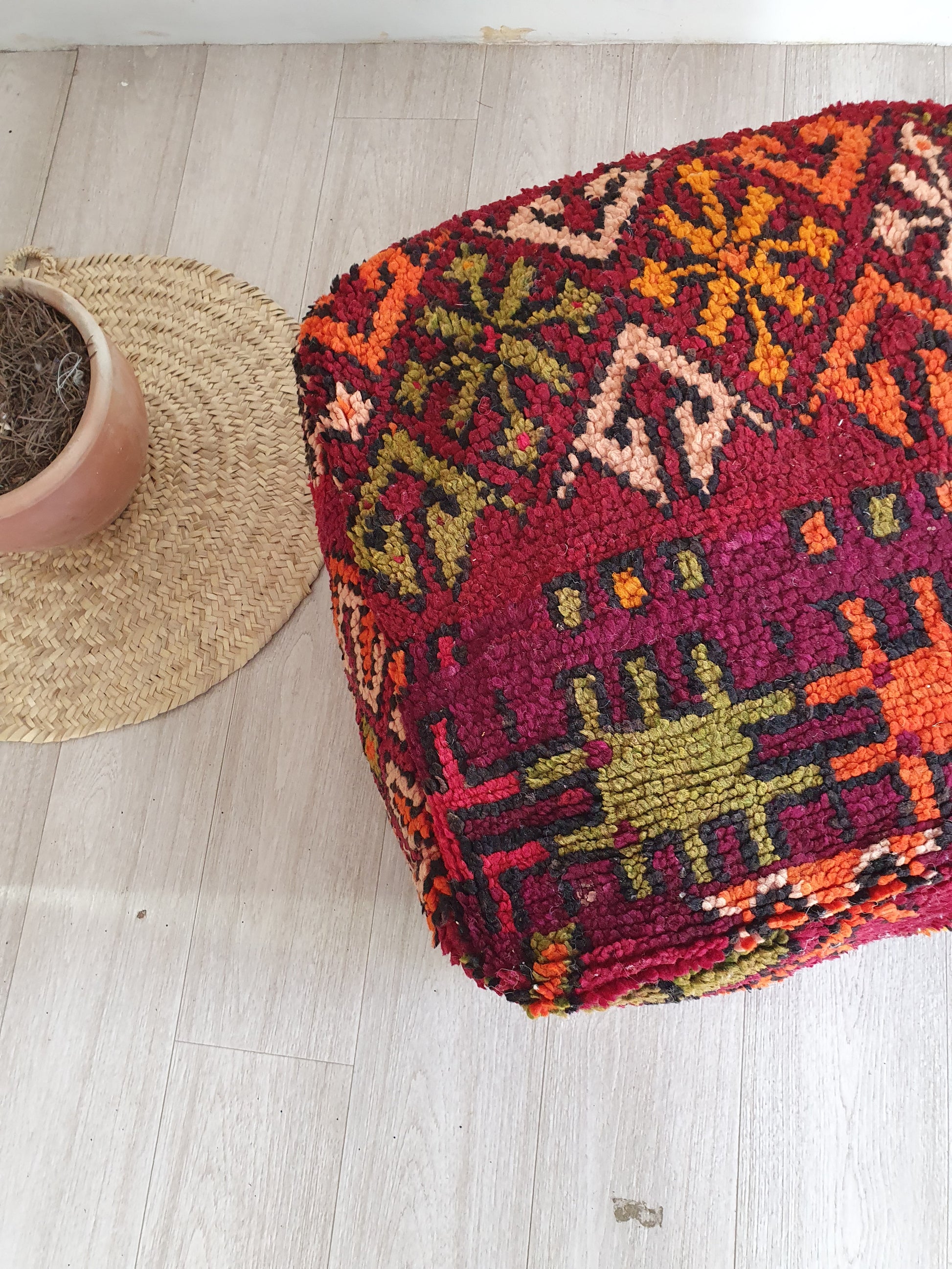 Celui-ci d’un genre pouf marocain. Il est fabriqué à la main par des femmes berbères à partir de kilim vintage, Beni ourain, Azilal et d'autres types de tapis faits à la main. Chaque pouf est unique et chacun a une histoire.