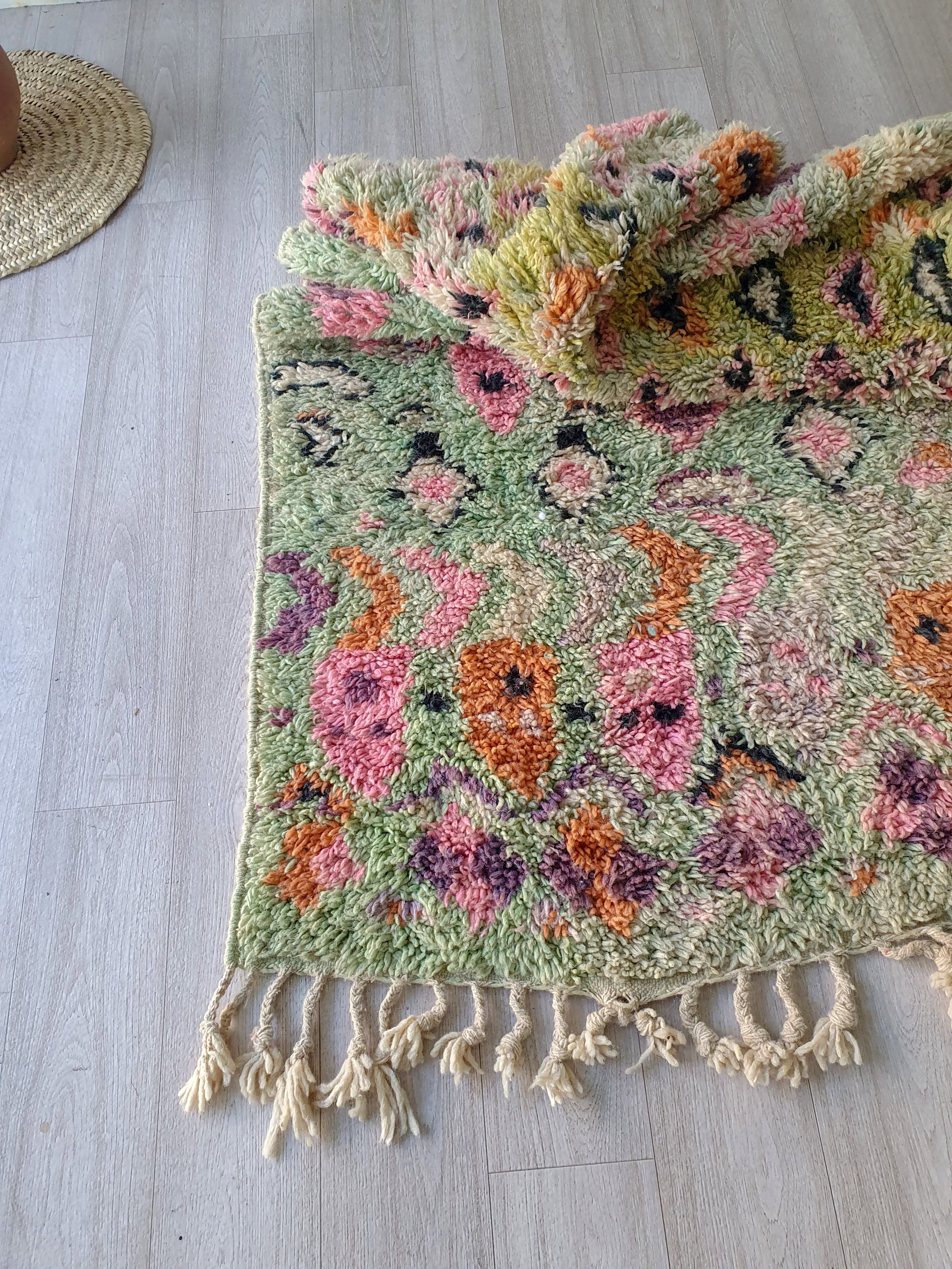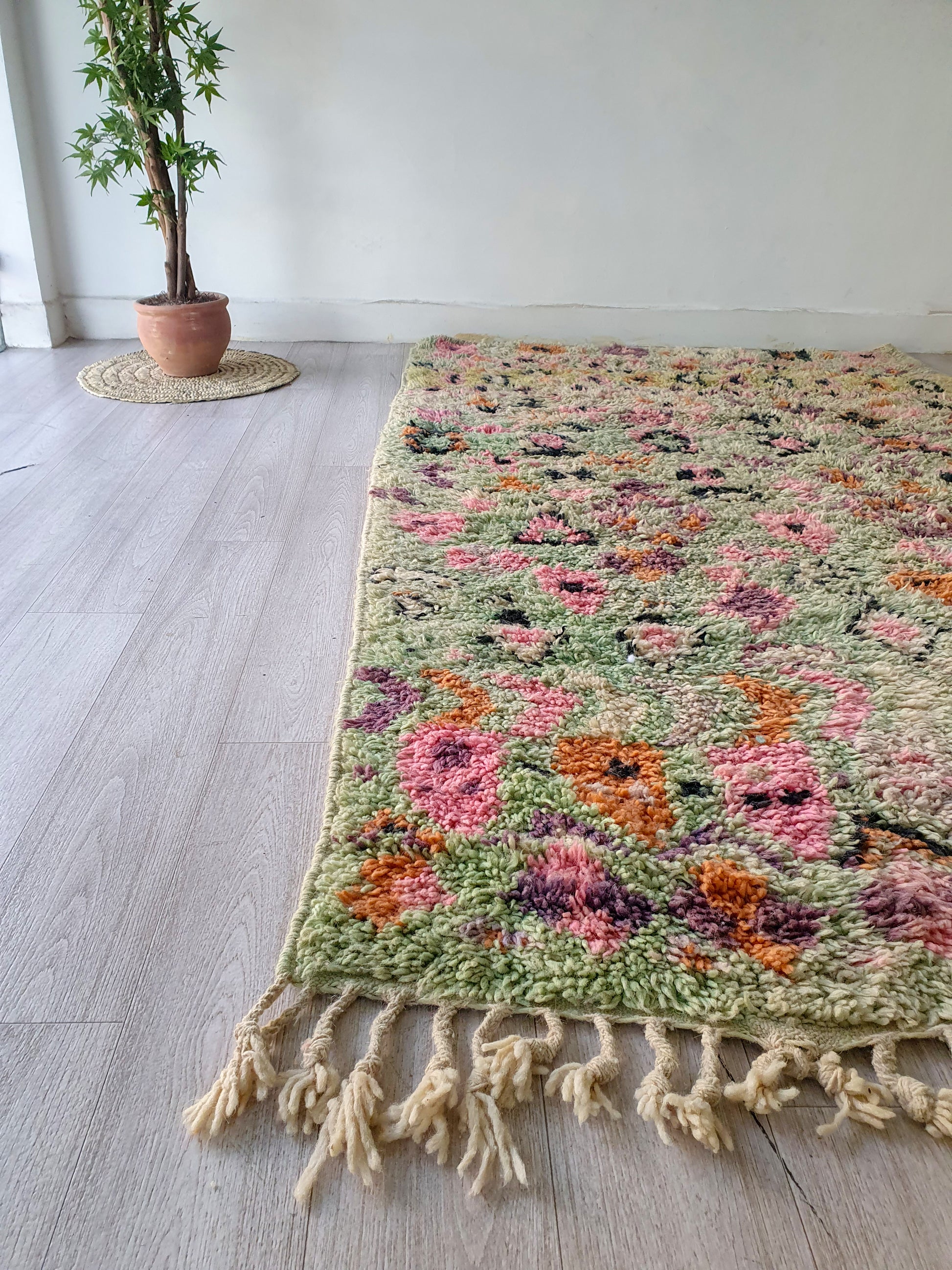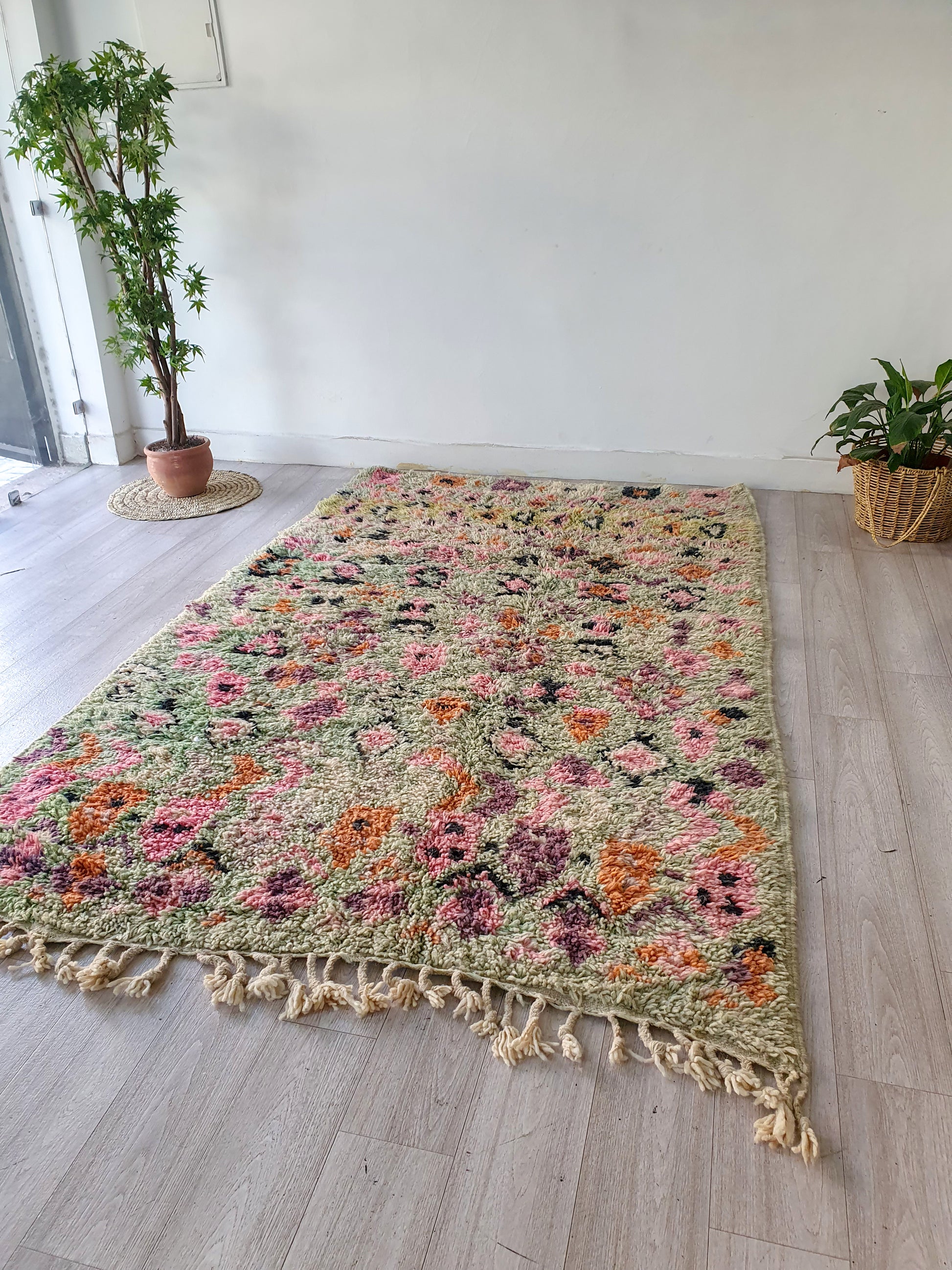 Veuillez noter que ces tapis sont entièrement tissés à la main par des femmes, donc toute imperfection mineure ne fait qu'ajouter à la beauté du tapis et à son caractère unique.