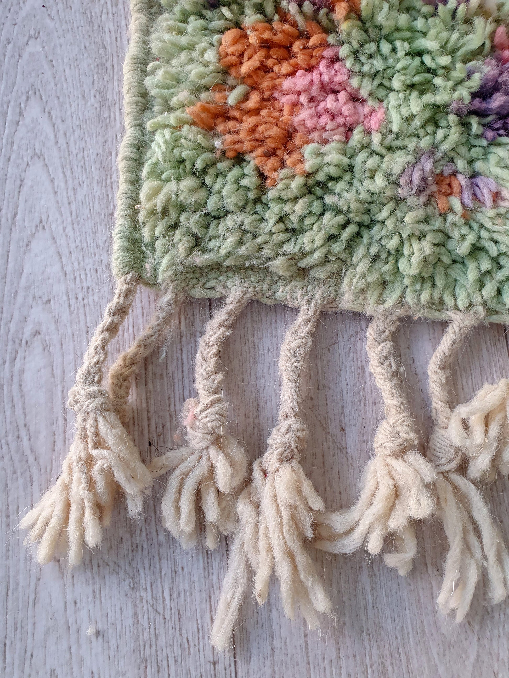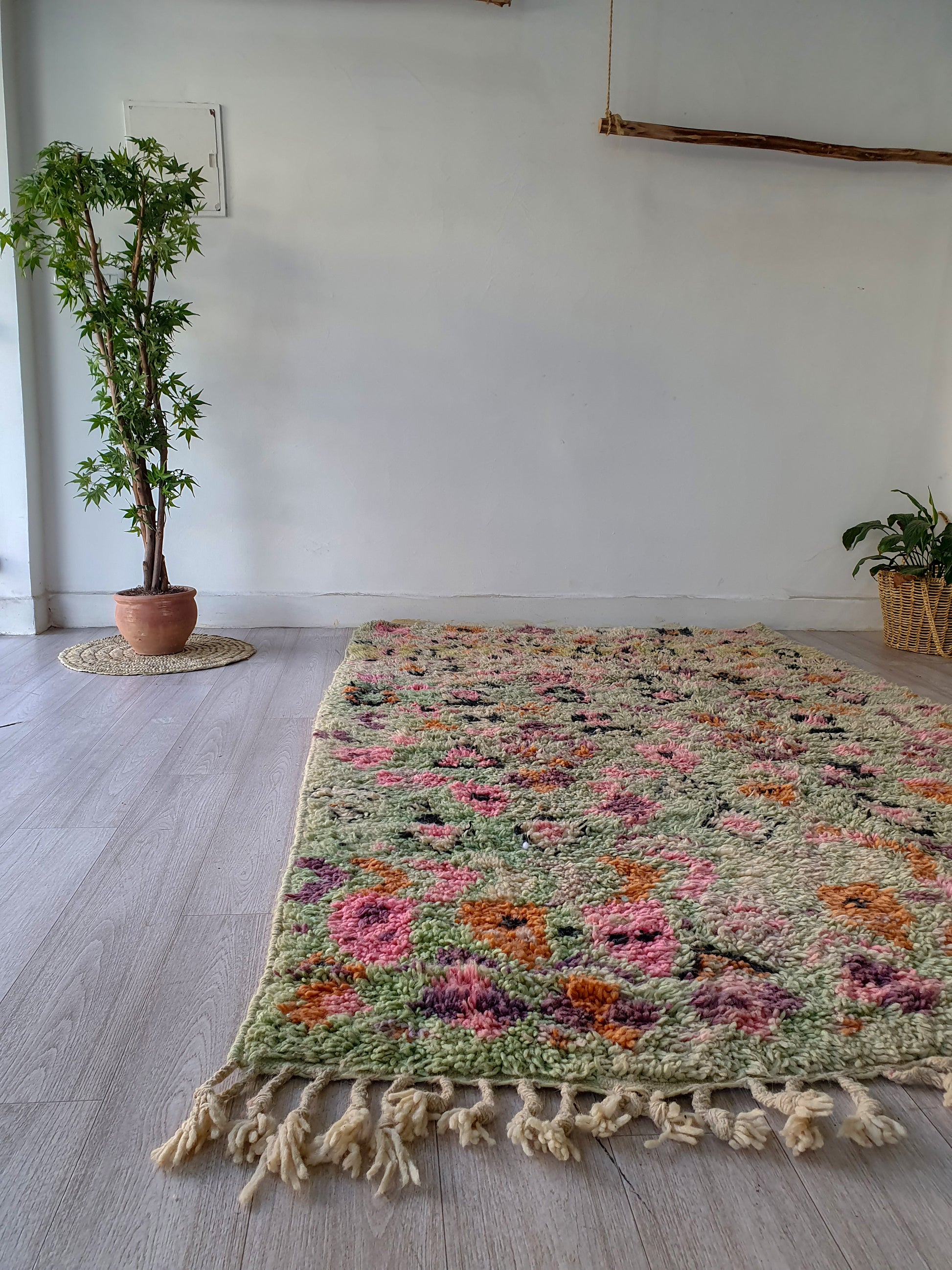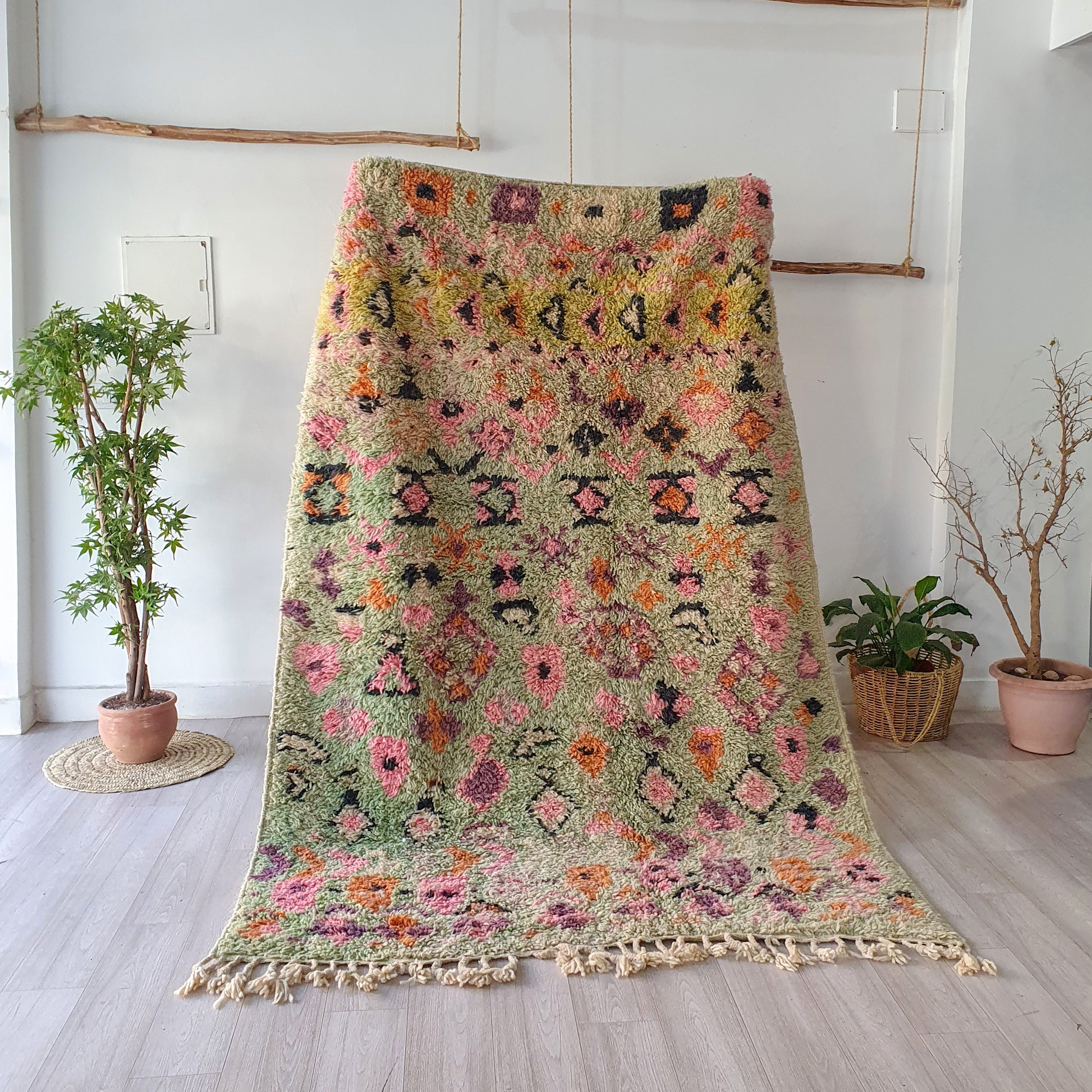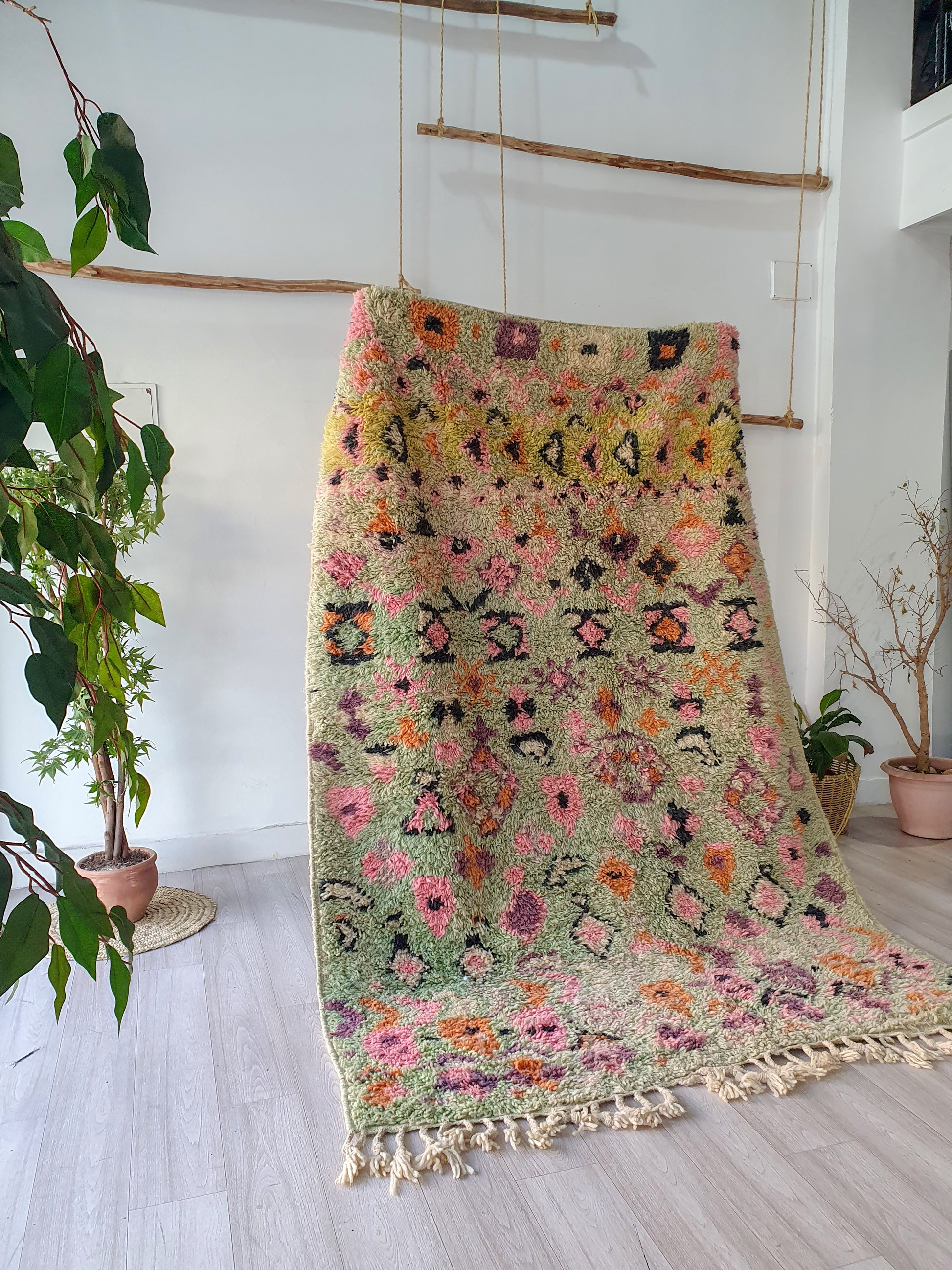 Veuillez noter que ces tapis sont entièrement tissés à la main par des femmes, donc toute imperfection mineure ne fait qu'ajouter à la beauté du tapis et à son caractère unique.