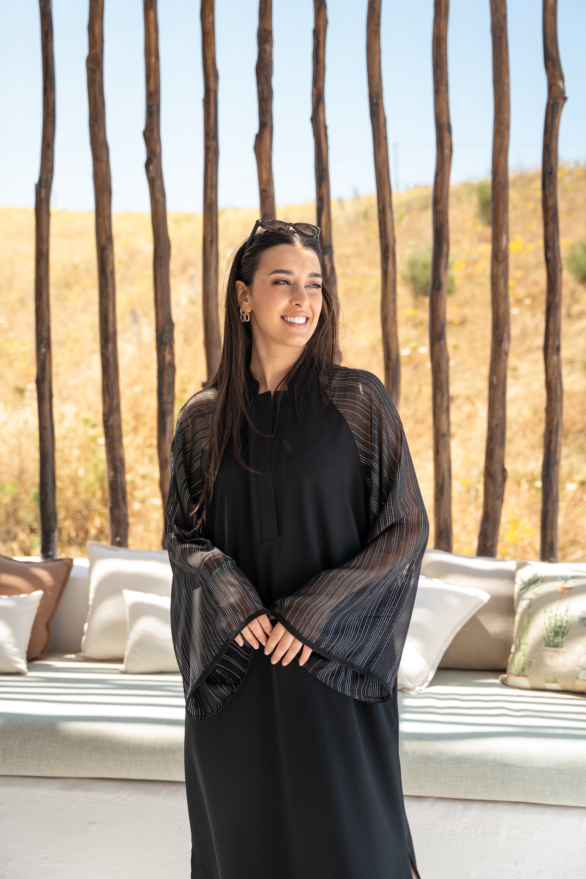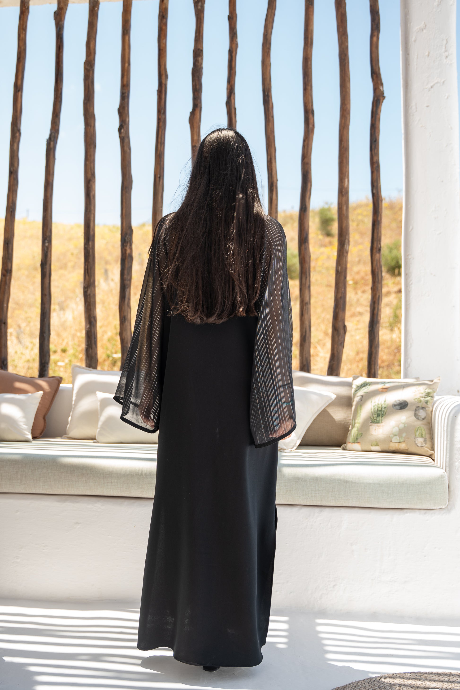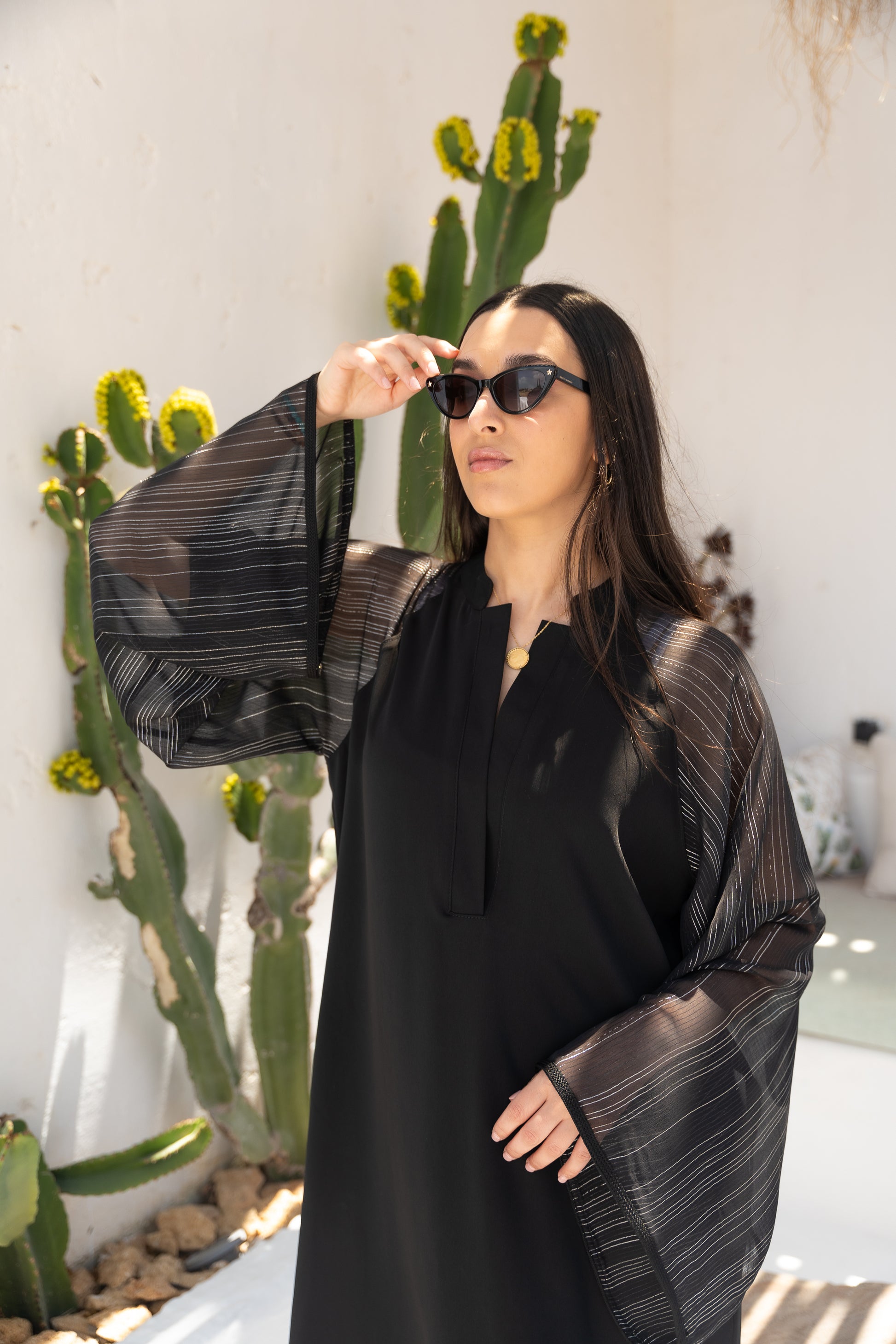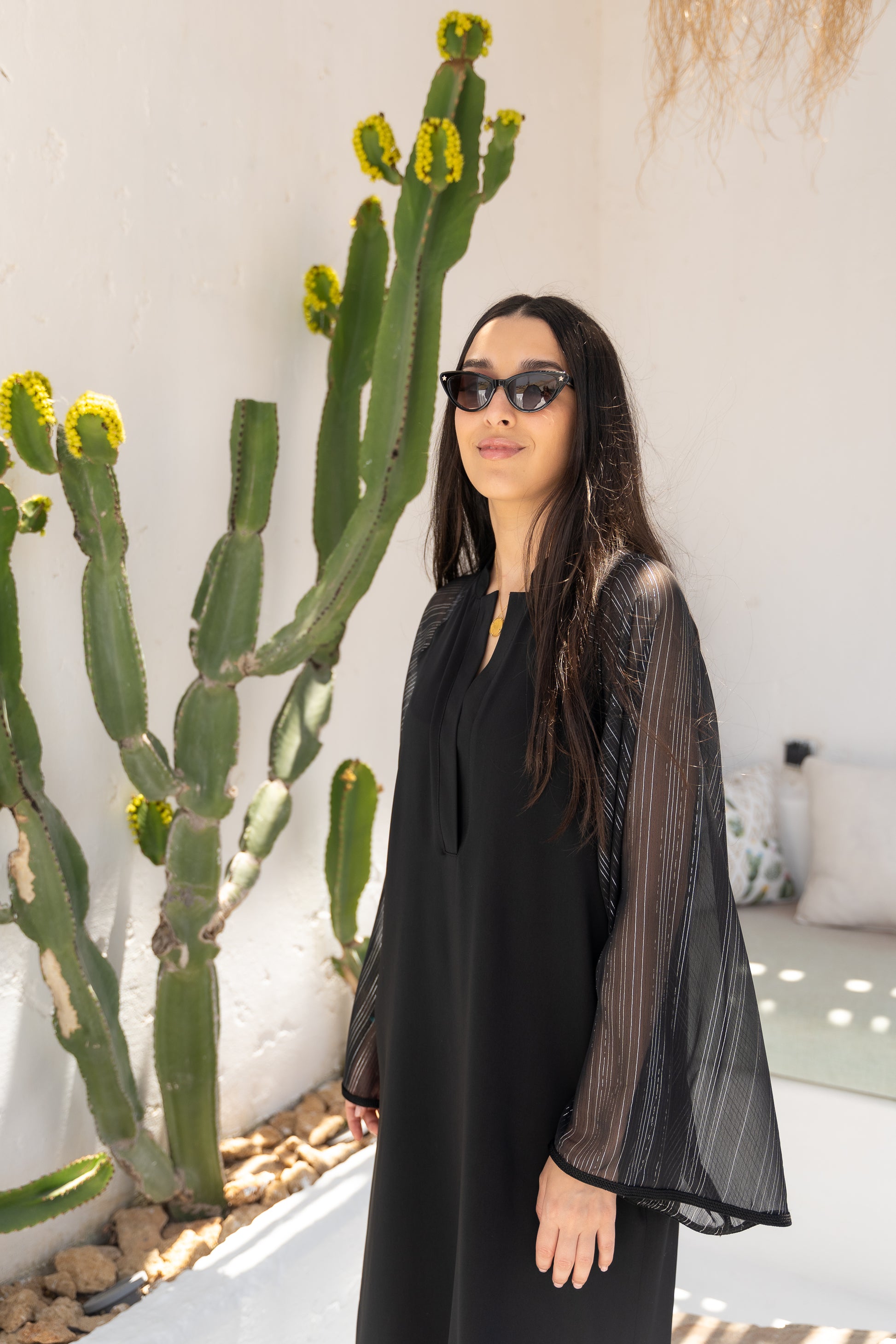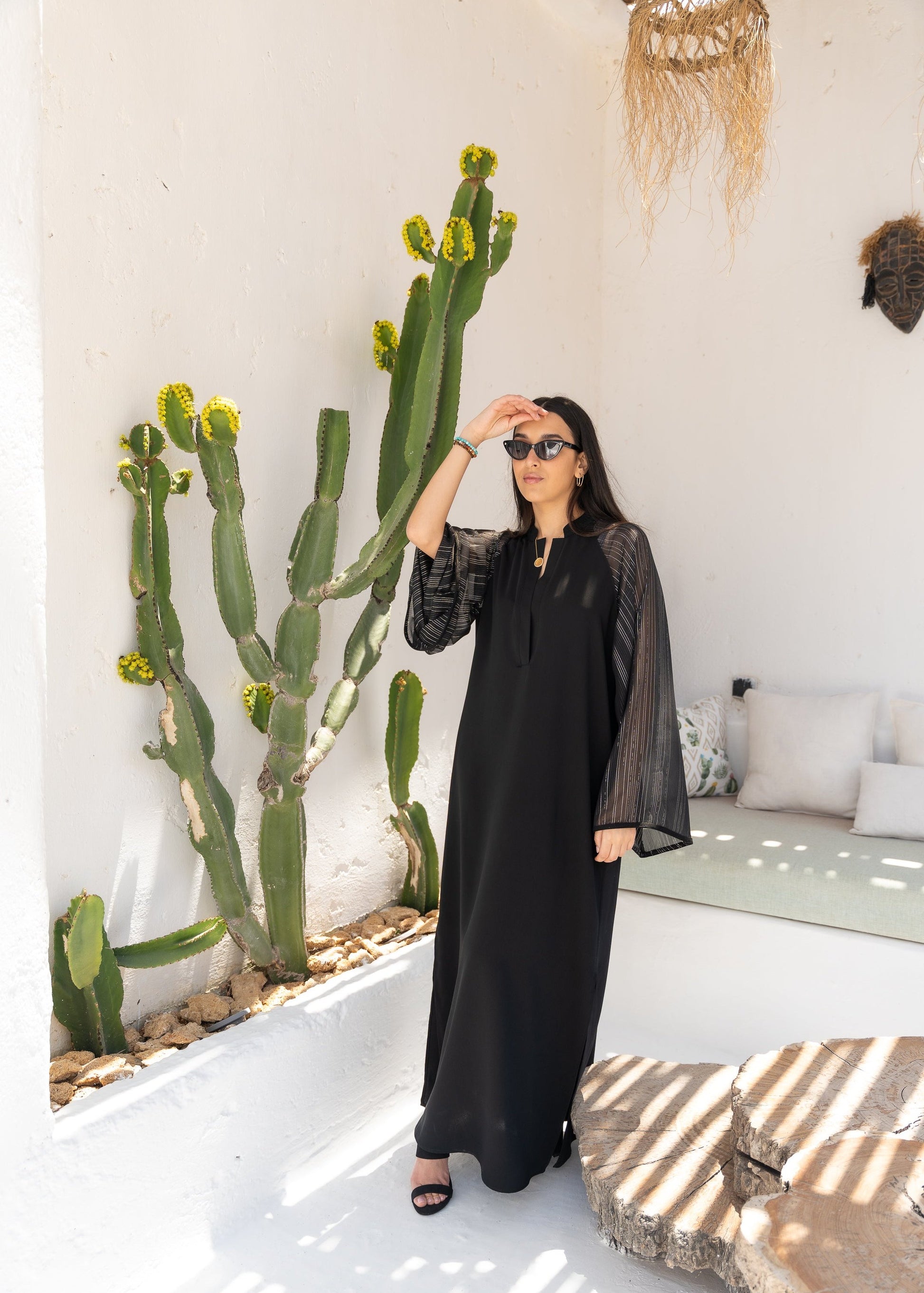 This beautiful black kaftan features elegant sheer sleeves and chic silk trimming. Effortlessly stylish, it’s the perfect blend of sophistication and modern flair