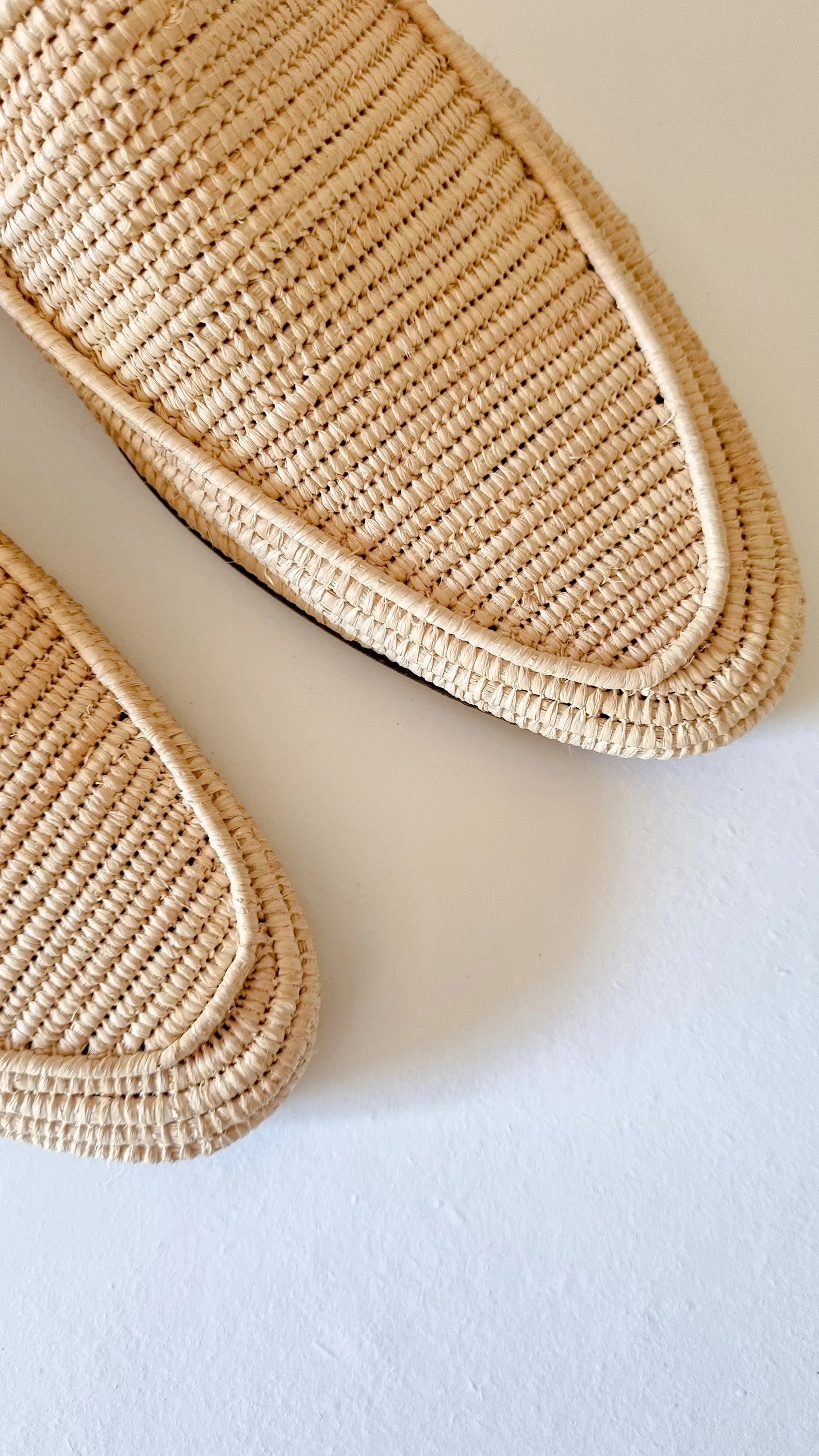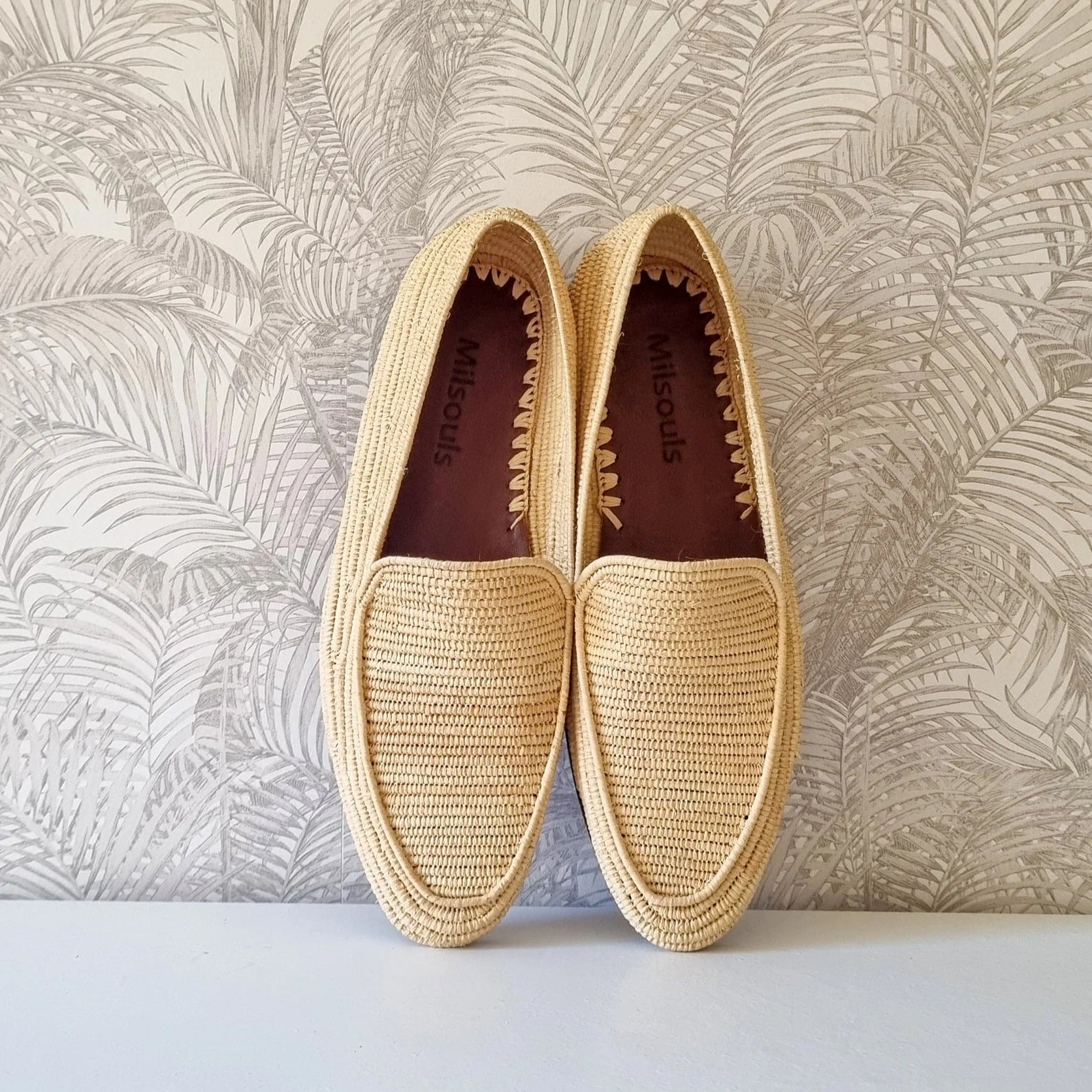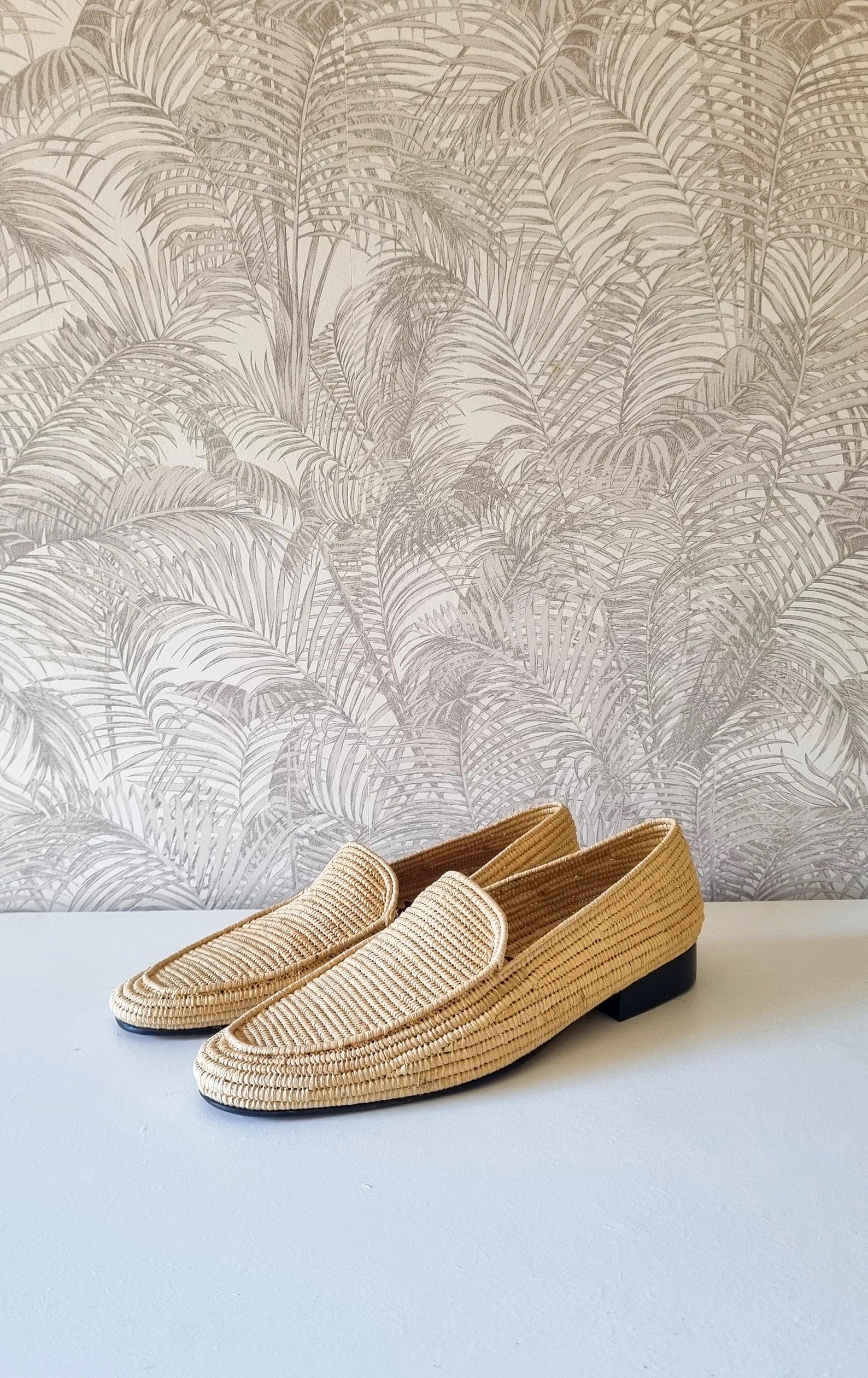The upper part is handmade from palm leaves also known as raffia. It is fully handmade where the raffia is weaved by women and then the soles are assembled from high end real leather. The insoles are also made from very good quality real leather.