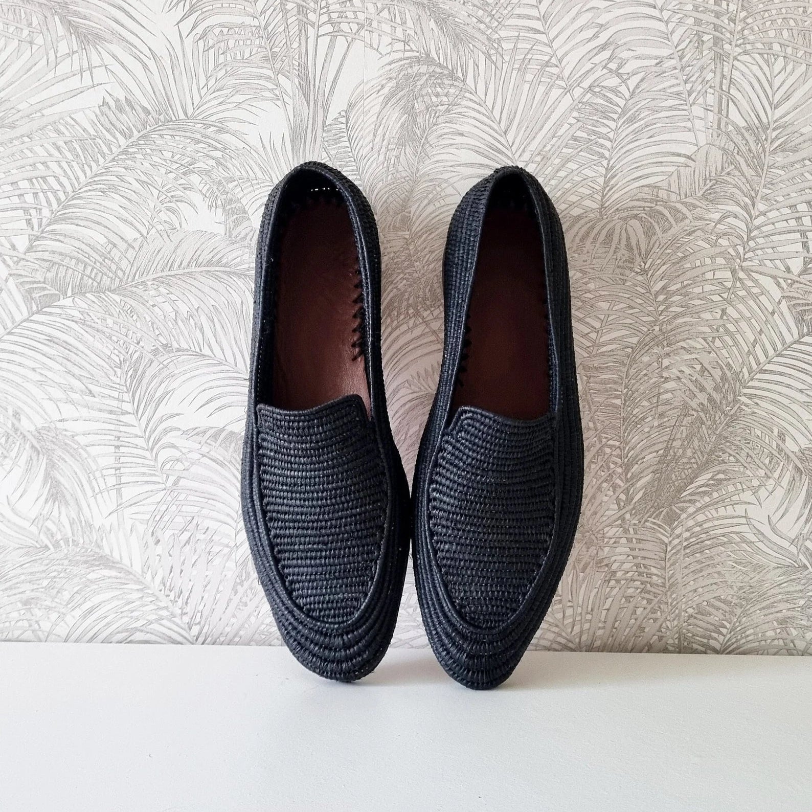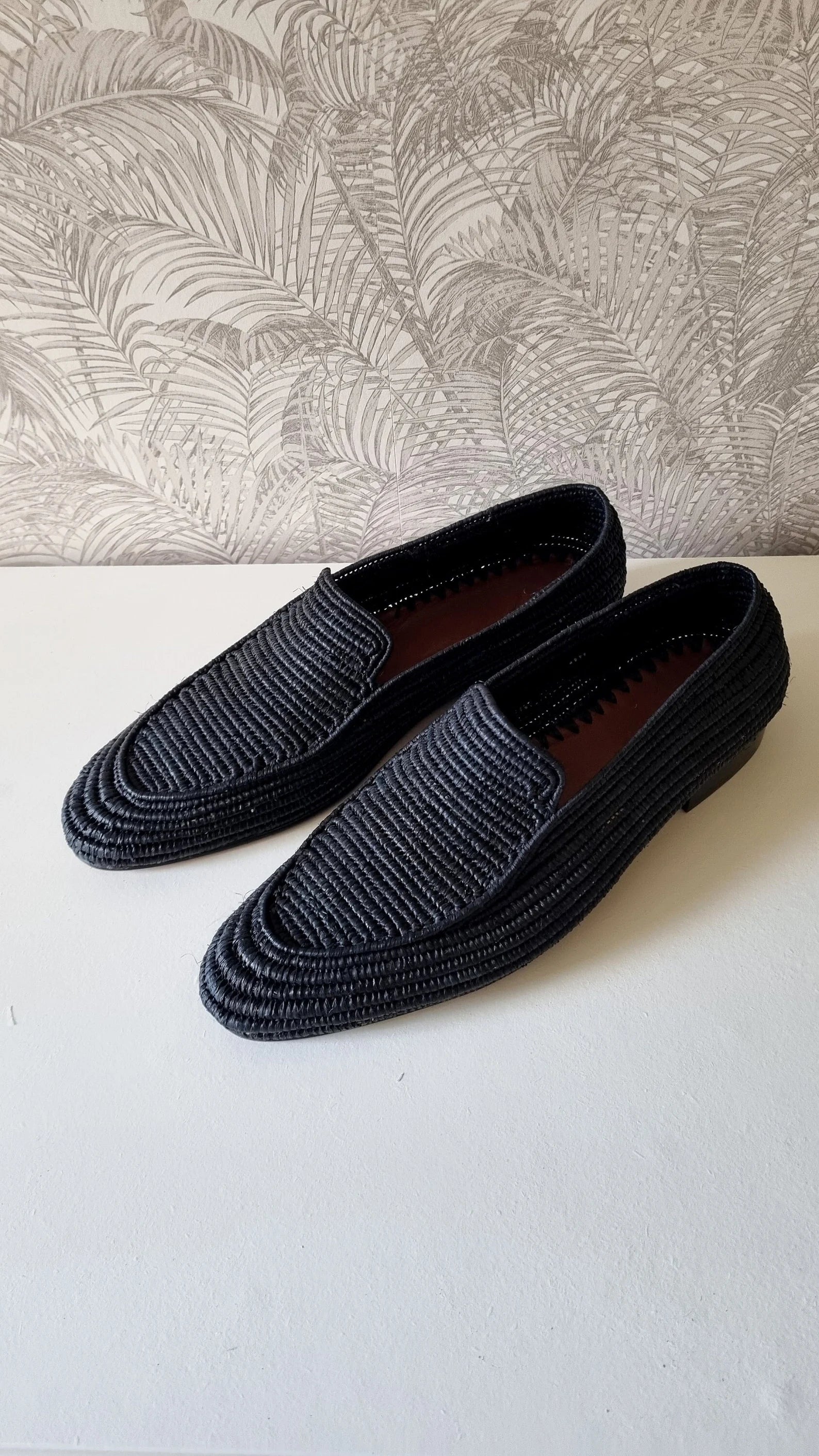 The upper part is handmade from palm leaves also known as raffia. It is fully handmade where the raffia is weaved by women and then the soles are assembled from high end real leather. The insoles are also made from very good quality real leather.