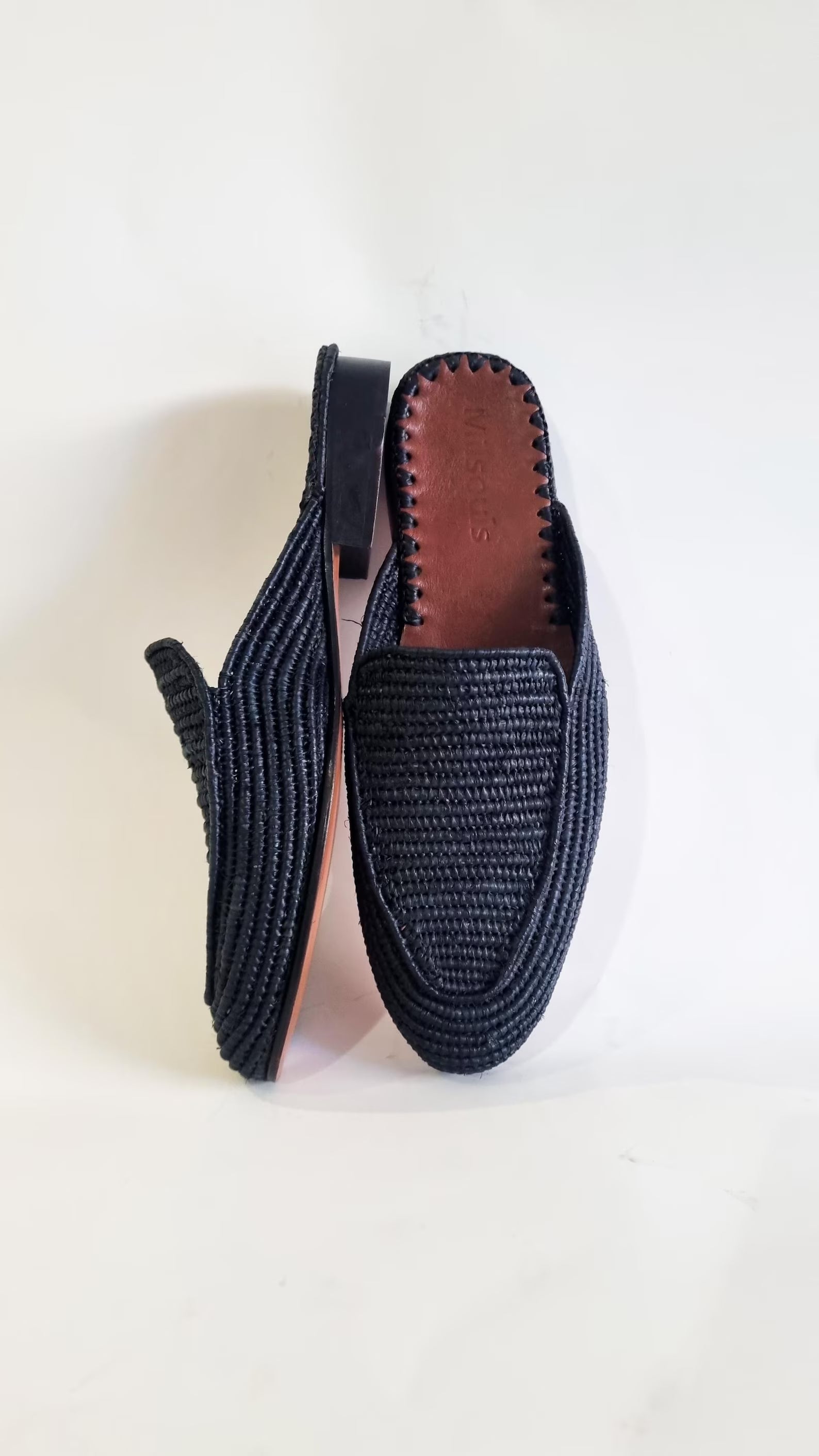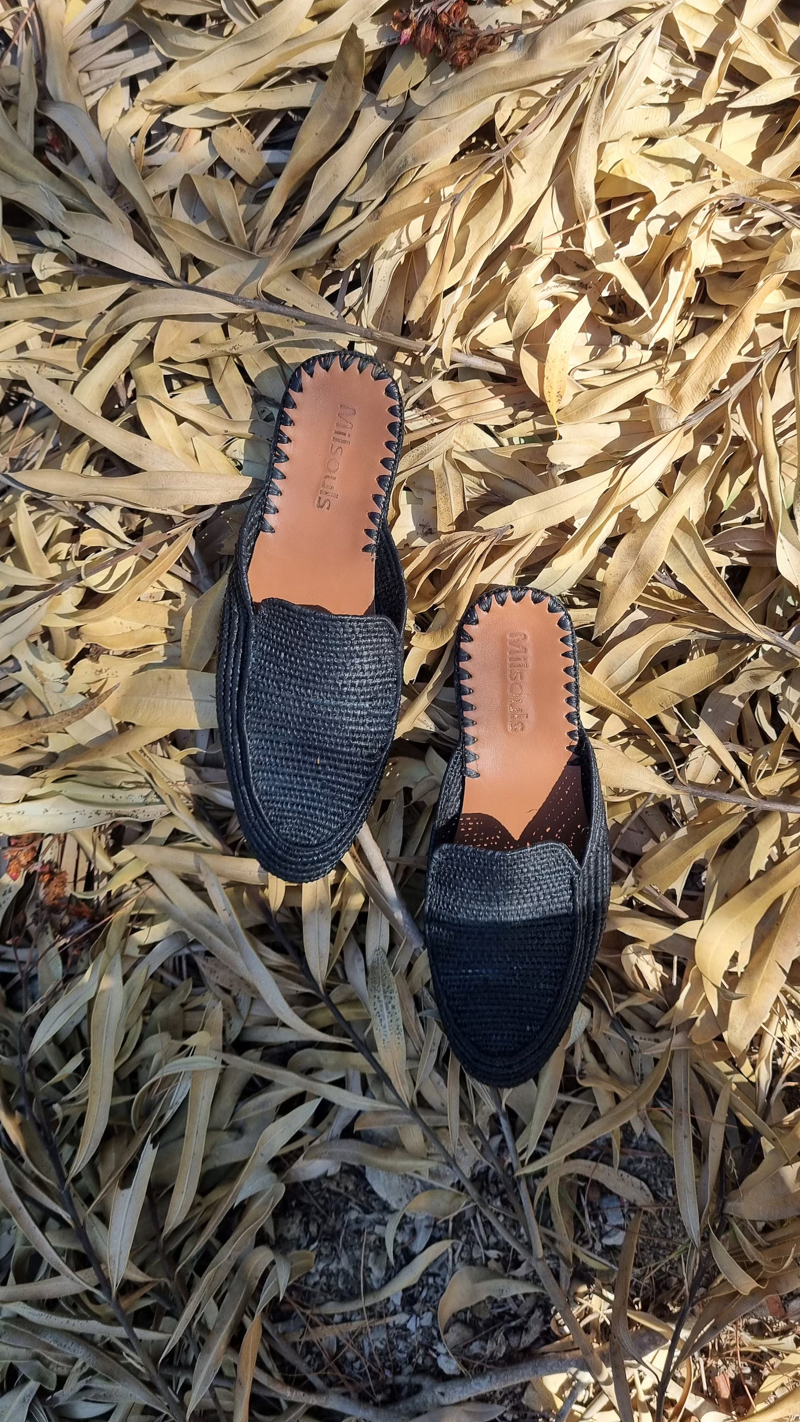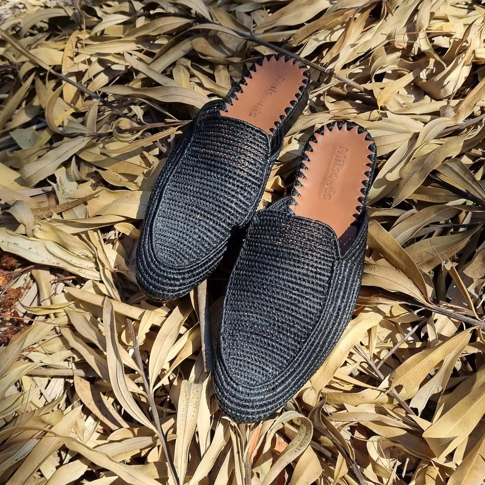 The upper part is handmade from palm leaves also known as raffia. It is fully handmade where the raffia is weaved by women and then the soles are assembled from high end real leather. The insoles are also made from very good quality real leather.
