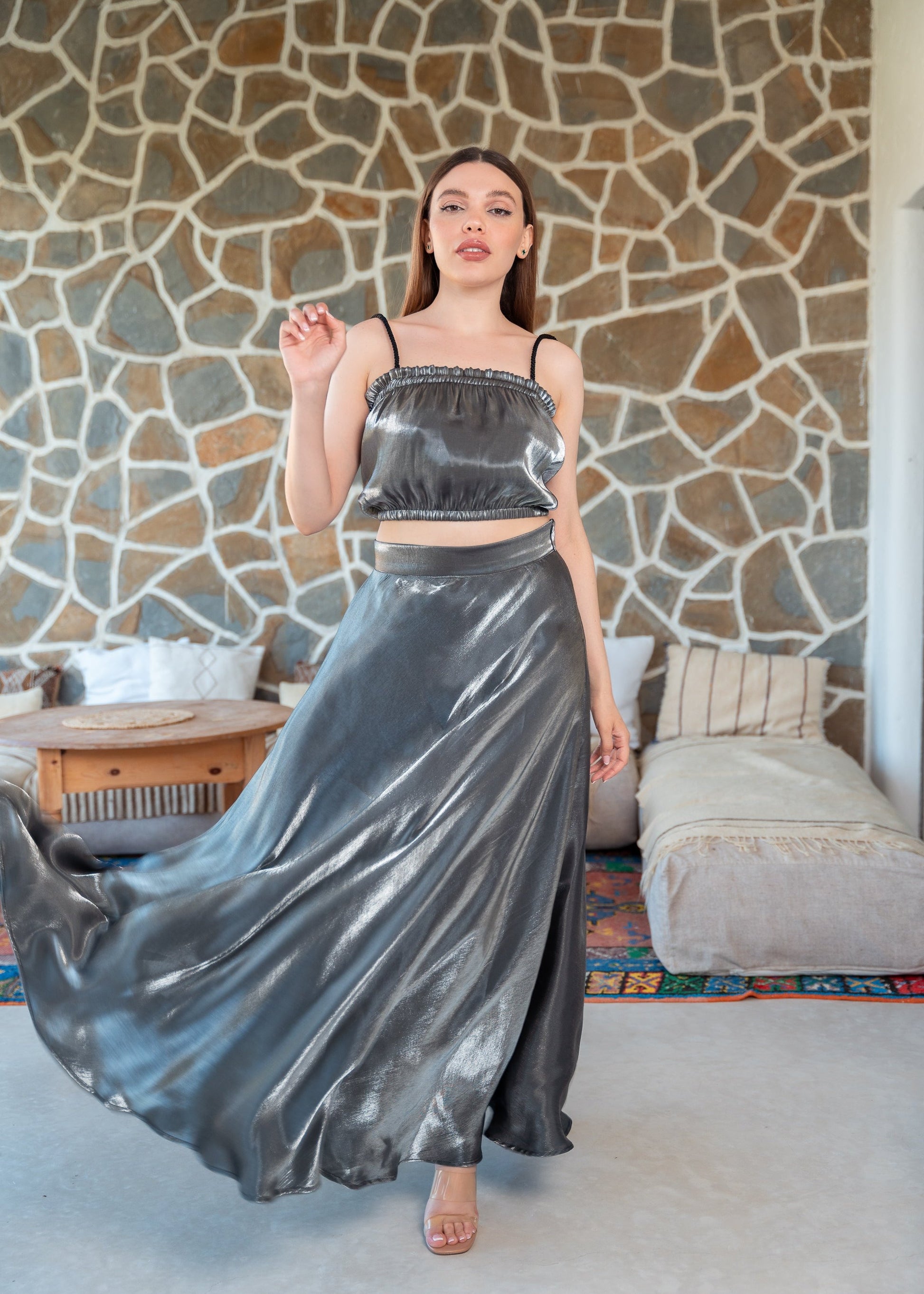 Turn heads in this stunning skirt and crop top set, crafted from the softest satin with a shimmering silver finish. The ensemble is elevated by handcrafted silk straps, offering a touch of luxury and artistry. Perfect for glamorous nights out and unforgettable parties, this set combines elegance and comfort, ensuring you make a statement wherever you go.