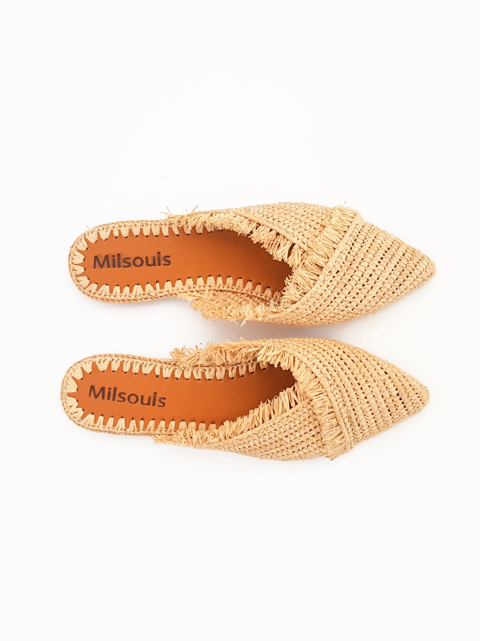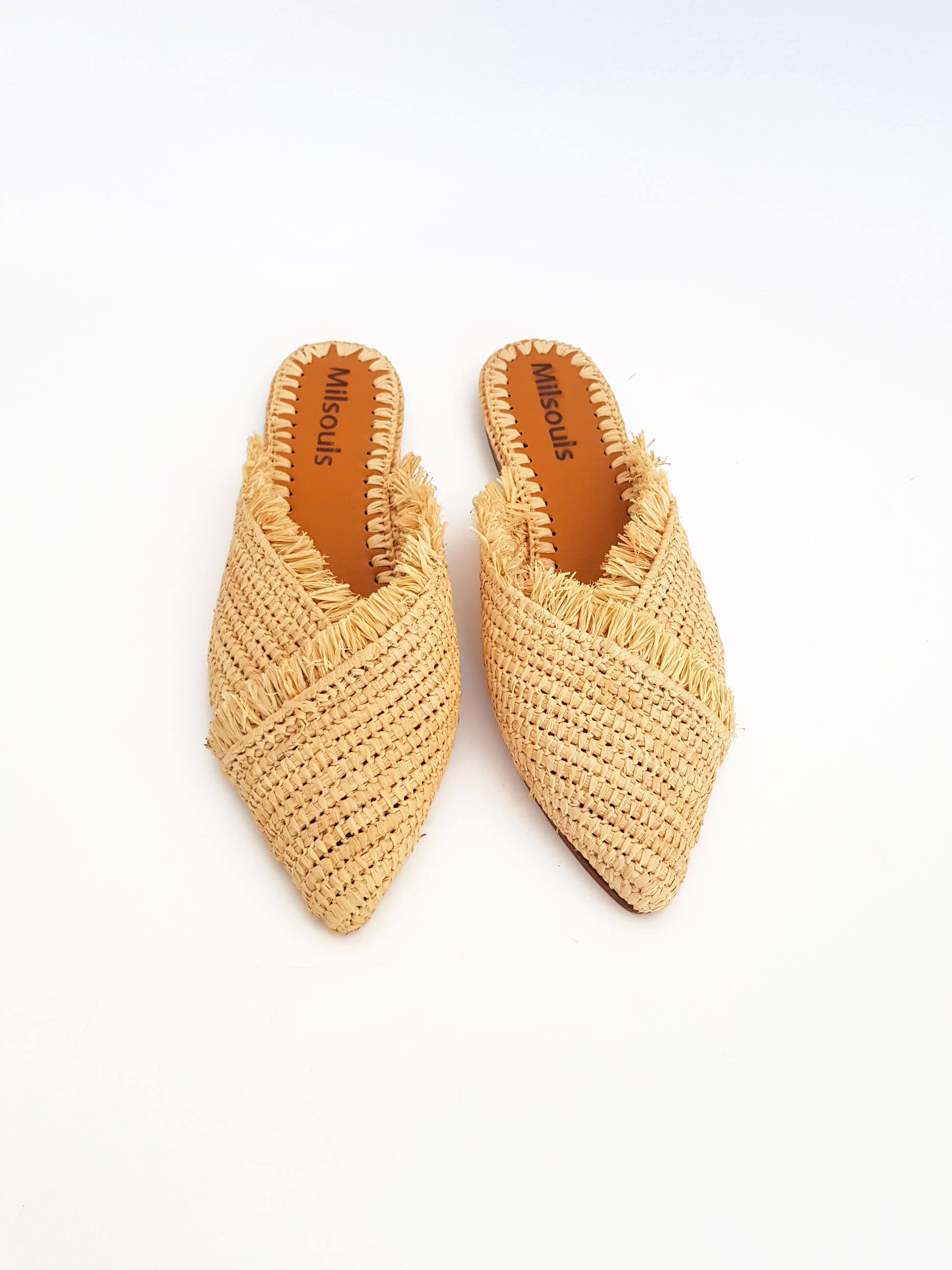 The upper part is handmade from palm leaves also known as raffia. It is fully handmade where the raffia is weaved by women artisans and then the soles are assembled from high end real leather. The insoles are also made from premium real leather.