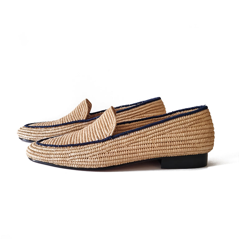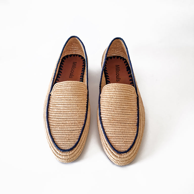 The upper part is handmade from palm leaves also known as raffia. It is fully handmade where the raffia is weaved by women and then the soles are assembled from high end real leather. The insoles are also made from very good quality real leather.